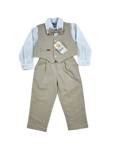 Conjunto social longo infantil, beje. Composto por: 1 camisa social manga longa lisa,1 colete liso bolso fake.1 calça com bolsos, elástico traseiro e 1 gravata borboleta.