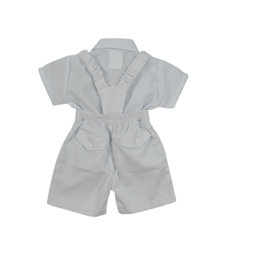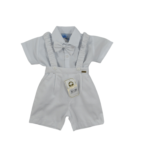 CONJUNTO CURTO, CAMISA MANGA CURTA NA COR BRANCA, BERMUDA COM SUSPENSSÓRIO É GRAVATA BORBOLETA.