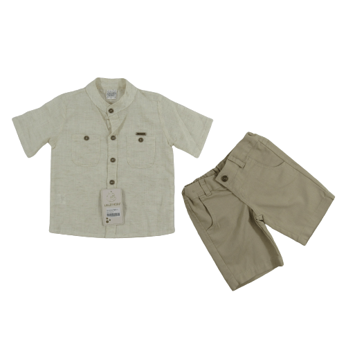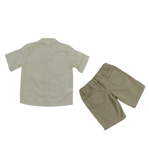 Conjunto social curto infantil. Composto por: 1 camisa social manga curta lisa com bolso, 1 bermuda sarja color palha, com bolsos, fecho botão. Cós com regulagem, elástico traseiro ajustável