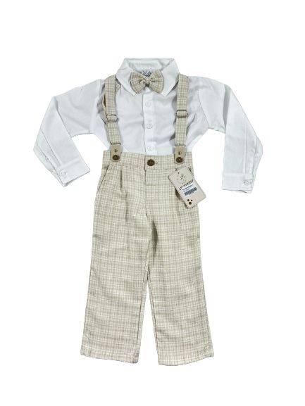 Conjunto social longo infantil palha. Composto por: 1 camisa social manga longa lisa ,1 calça bege, com bolsos frontal, fecho botão, 1 gravata borboleta. Cós com regulagem ,elástico traseiro ajustável e suspensório.