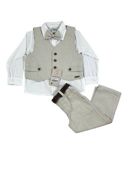 Conjunto social longo infantil. Composto por: 1 camisa social manga longa lisa 1 colete com bolso falso, 1gravata borboleta, 1 bermuda sarja beje com bolsos e 1 cinto, fecho botão. Cós com regulagem, elástico traseiro ajustável.