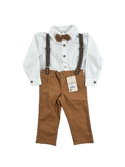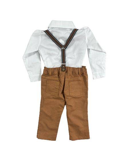 Conjunto social longo infantil . Composto por: 1 camisa social manga longa azul palha lisa ,1 calça lisa bege, com bolsos, fecho botão. Cós com regulagem ,elástico traseiro ajustável e suspensório.