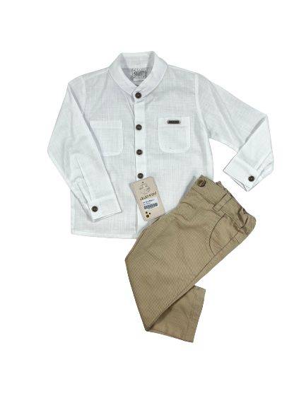 Conjunto social longo infantil palha. Composto por: 1 camisa manga longa lisa bolso e gola padre, 1 calça sarja color palha, com bolsos, fecho botão. Cós com elástico traseiro ajustável.