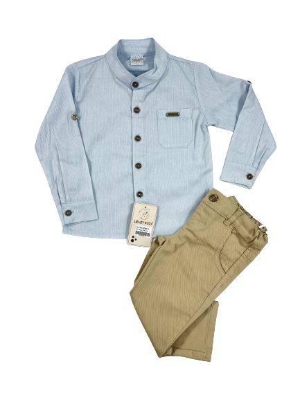 Conjunto social longo infantil azul palha. Composto por: 1 camisa manga longa azul palha, lisa bolso e gola padre, 1 calça sarja color palha, com bolsos, fecho botão. Cós com elástico traseiro ajustável.