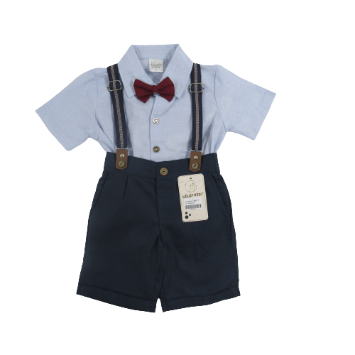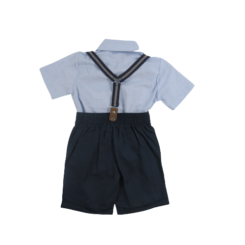 Conjunto social curto infantil. Composto por: 1camisa social manga curta lisa azul bebê .1 bermuda cor marinho, com bolsos. Cós com elástico traseiro. Barra acabamento simples.
