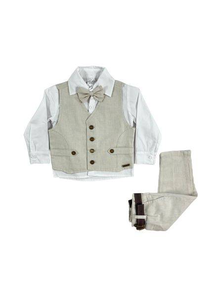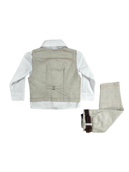 Conjunto social longo infantil. Composto por: 1 camisa social manga longa lisa 1 colete com bolso falso, 1gravata borboleta, 1 bermuda calça branca com bolsos e 1 cinto, fecho botão. Cós com regulagem, elástico traseiro ajustável.