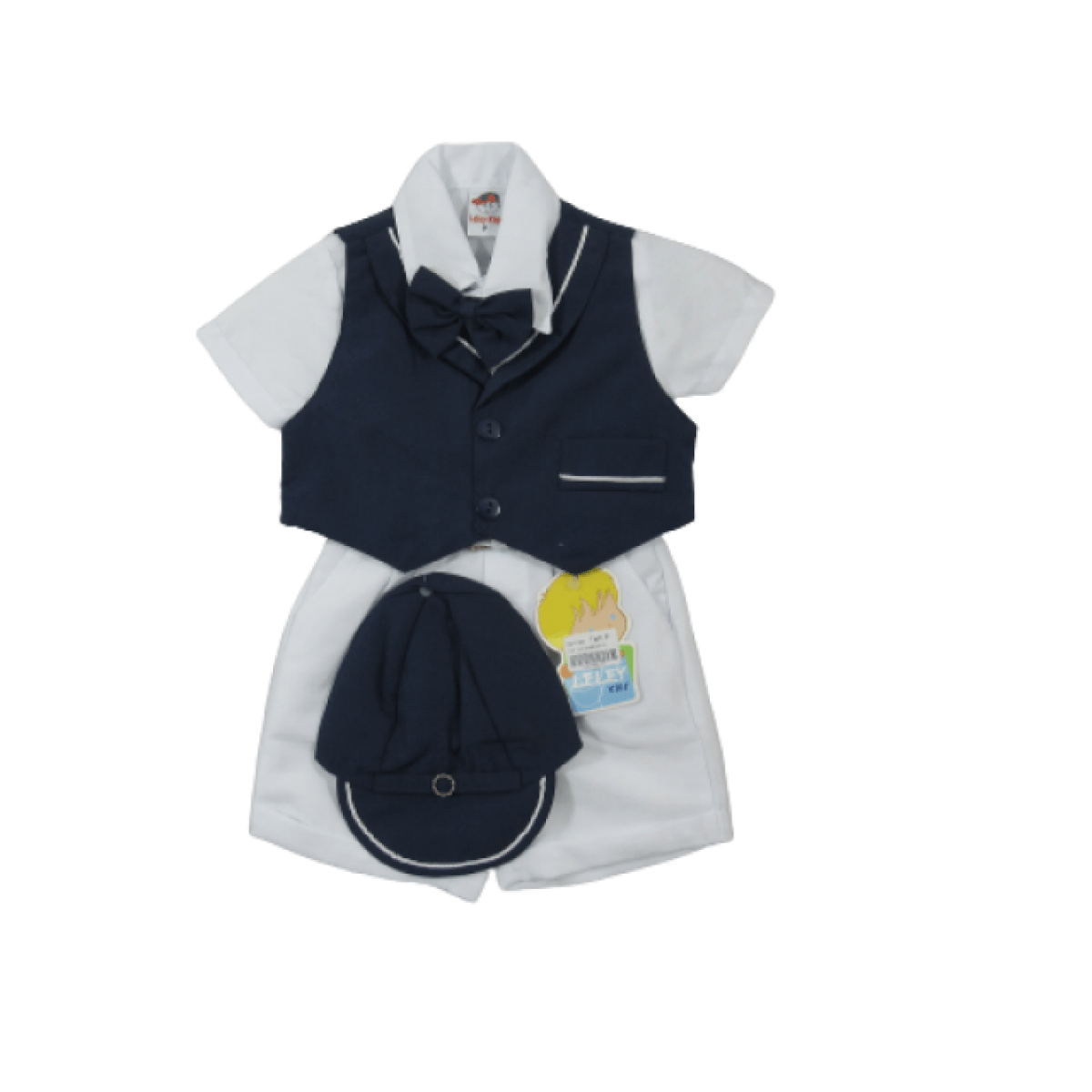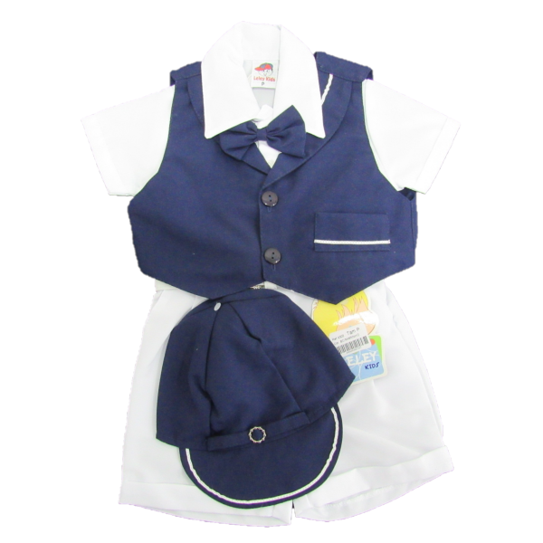 CONJUNTO CURTO,CAMISA E BERMUDA COM CINTO,GRAVATA BORBOLETA,COLETE E BOINA.