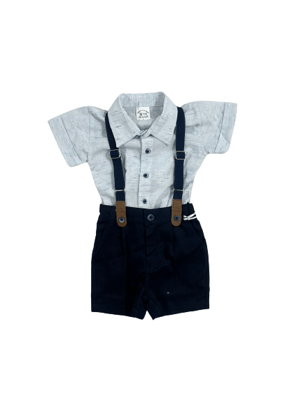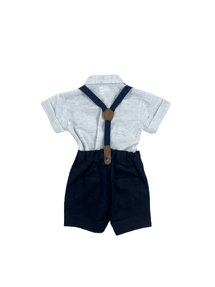 Conjunto social curto infantil azul. Composto por: 1 camisa social manga curta, suspensório, 1bermuda lisa azul , com bolsos, fecho botão. Cós com regulagem ,elástico traseiro ajustável.