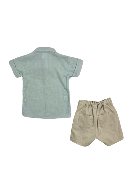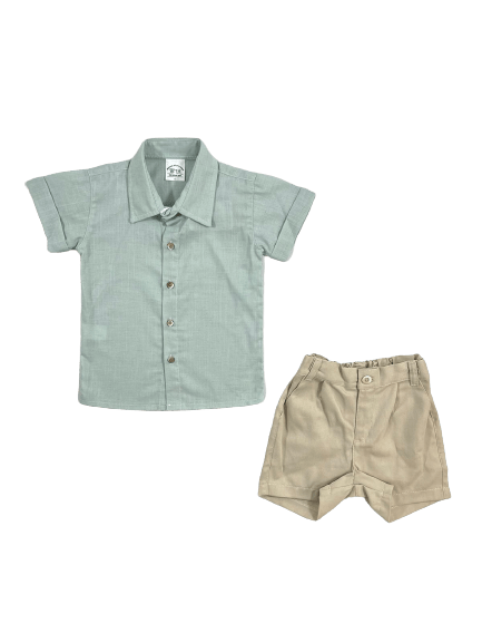 Conjunto social curto infantil. Composto por: 1 camisa social manga curta lisas .1 bermuda cor marfim com bolsos. Cós com elástico traseiro. Barra acabamento simples.