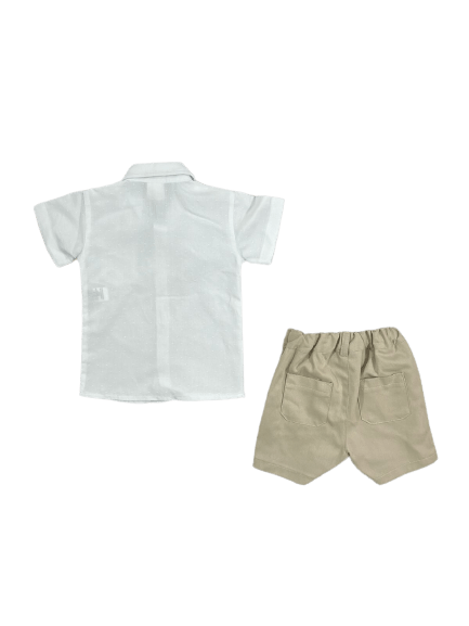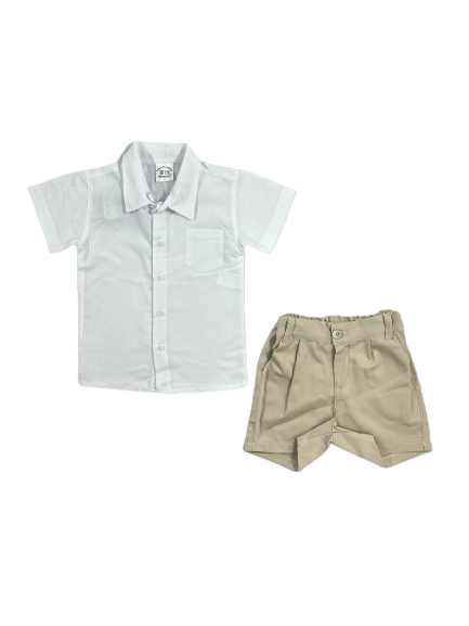 Conjunto social curto infantil. Composto por: 1 camisa social manga curta lisa com um bolso .1 bermuda cor marfim com bolsos. Cós com elástico traseiro. Barra acabamento simples.