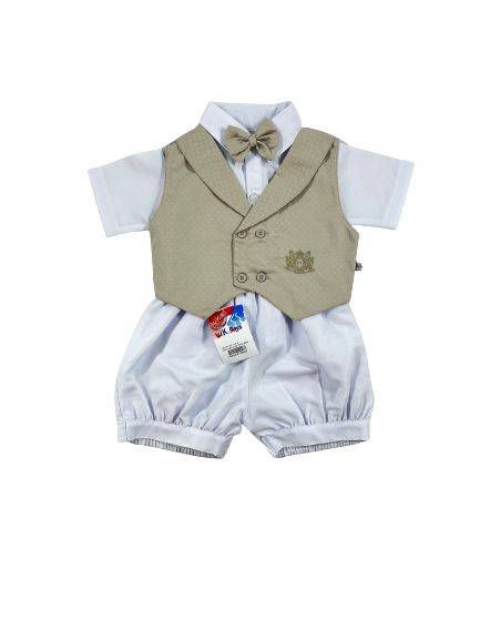 Conjunto social curto infantil, branco com beje. Composto por: 1 camisa social manga curta lisa,1 Colete lapela bordado TRAVELON.1 bermuda lisa branca sem bolsos, barra com elástico. Cós com elástico traseiro ajustável ao corpo.