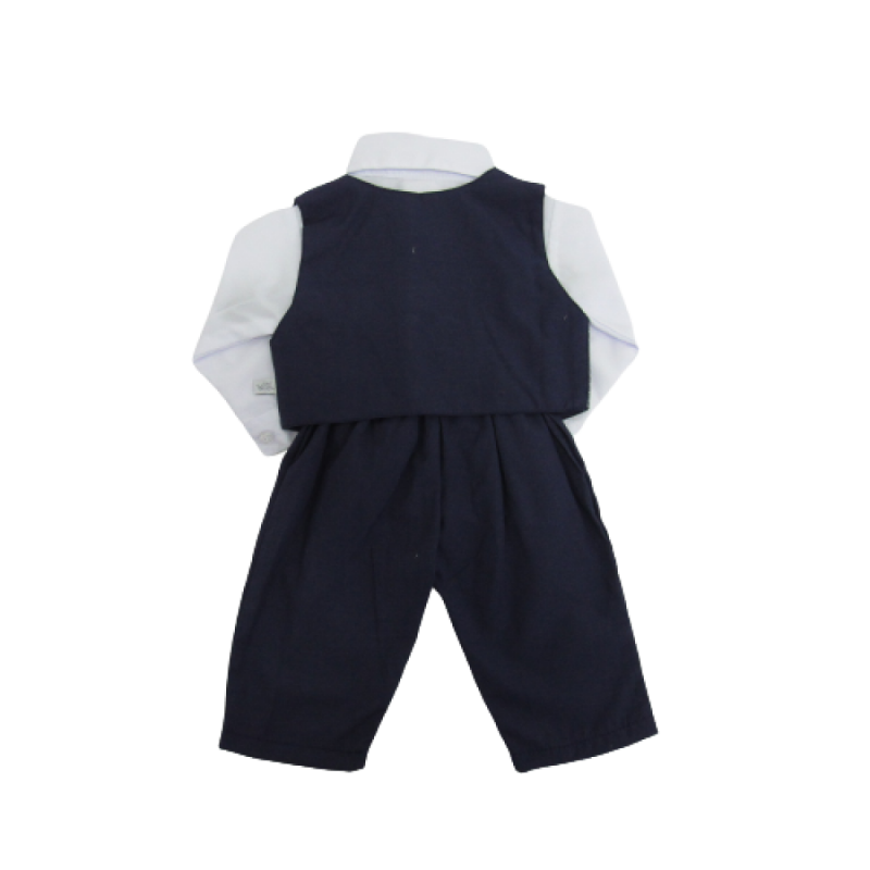 CONJUNTO SOCIAL LONGO, CAMISA MANGA LONGA LISA, COLETE COM BORDADO , CALÇA LISA E GRAVATA BORBOLETA. COR: AZUL MARINHO