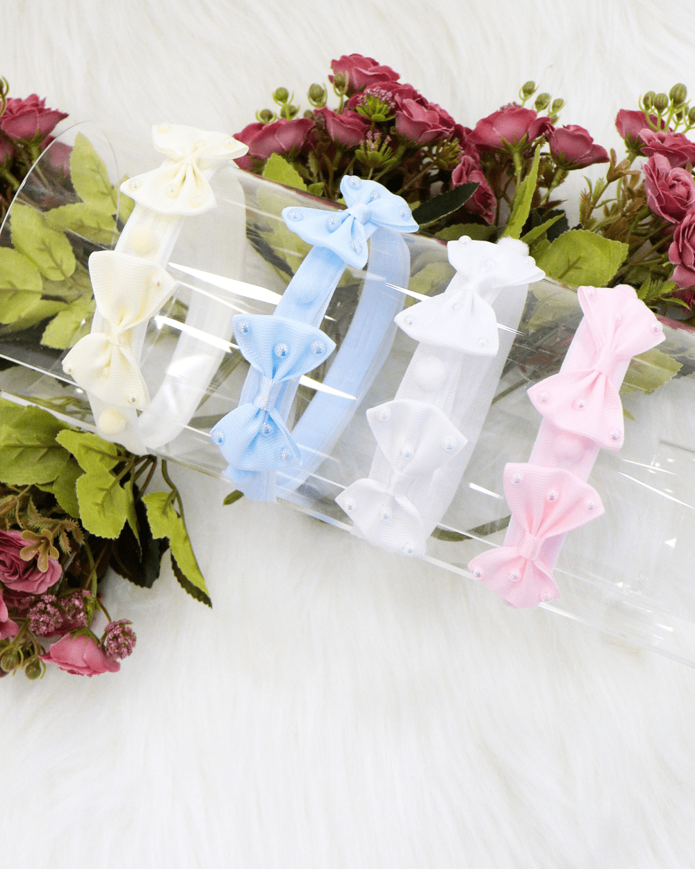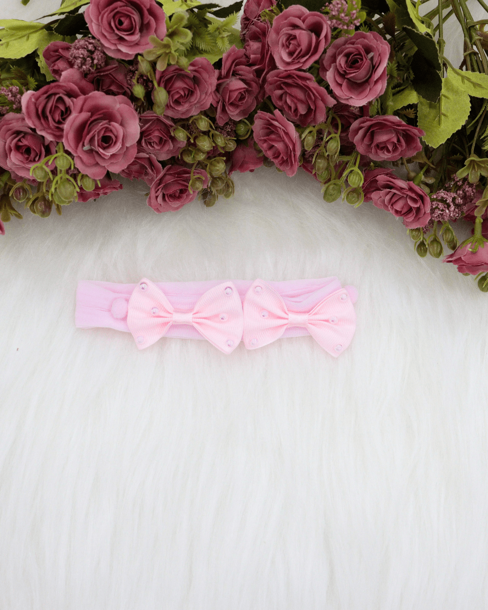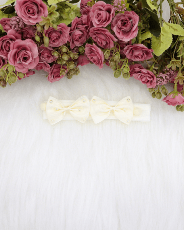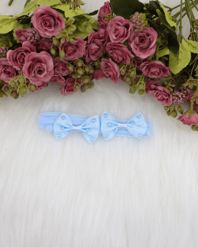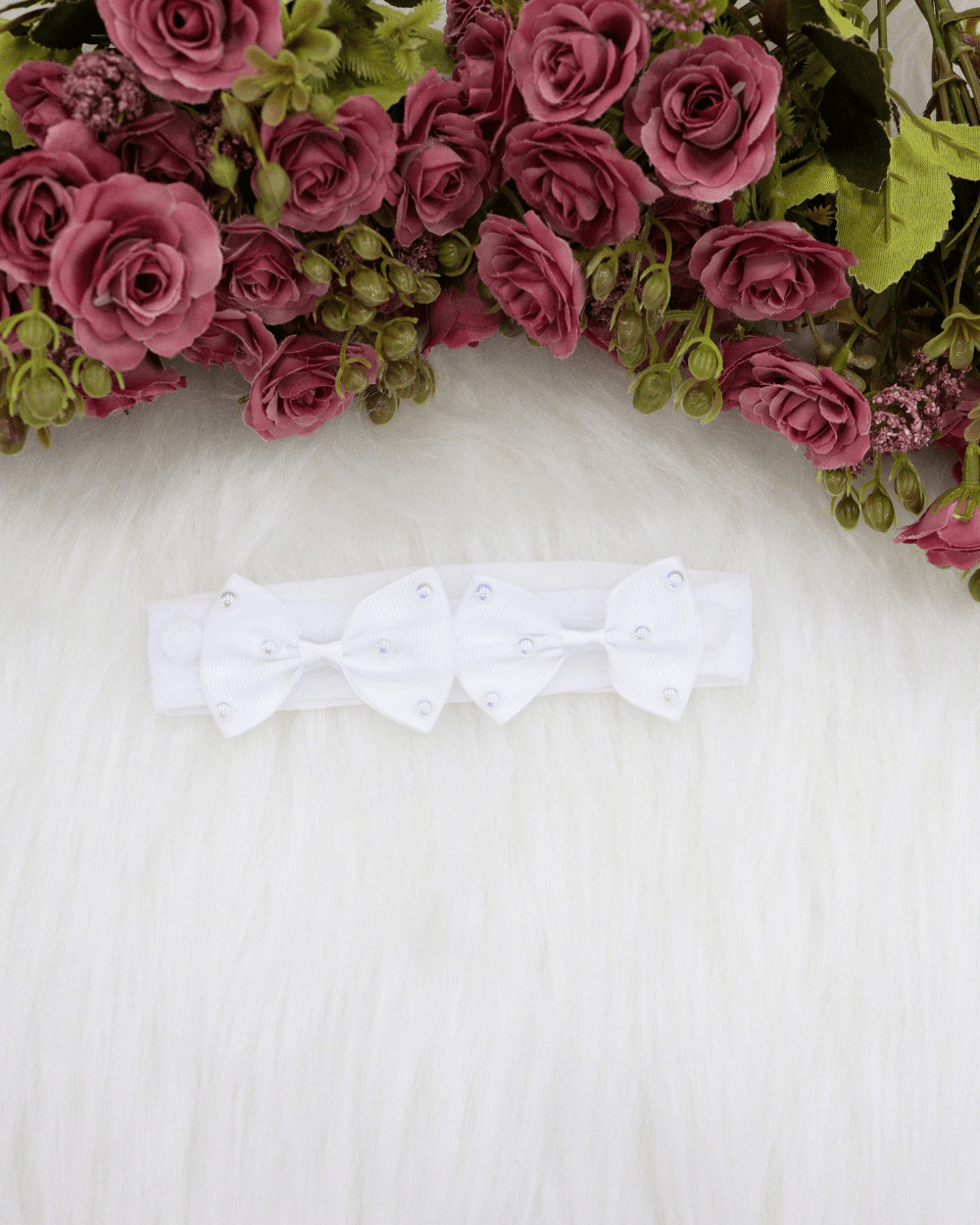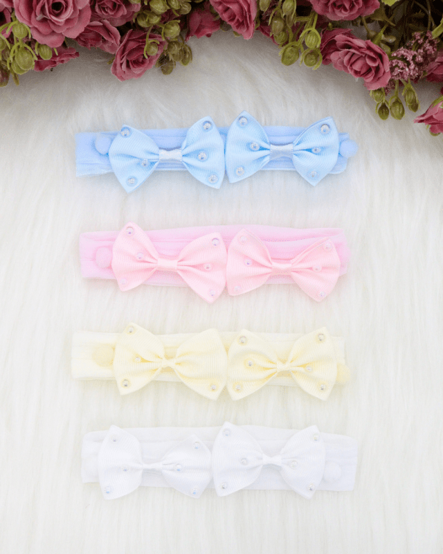 Faixa Lika Loka de meia para maior conforto não apertando a cabecinha da neném com lacinho e pérolas super delicada.