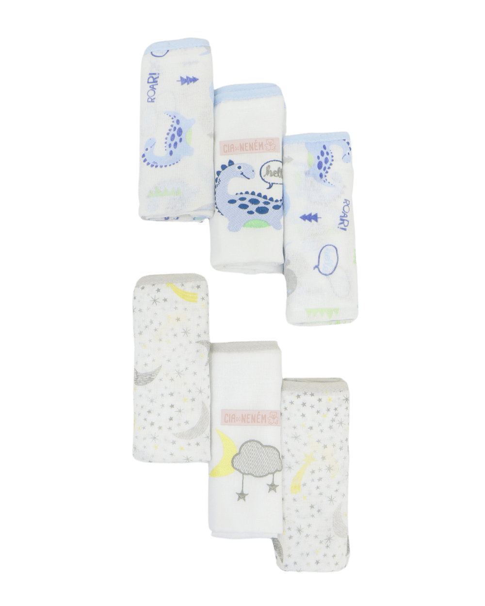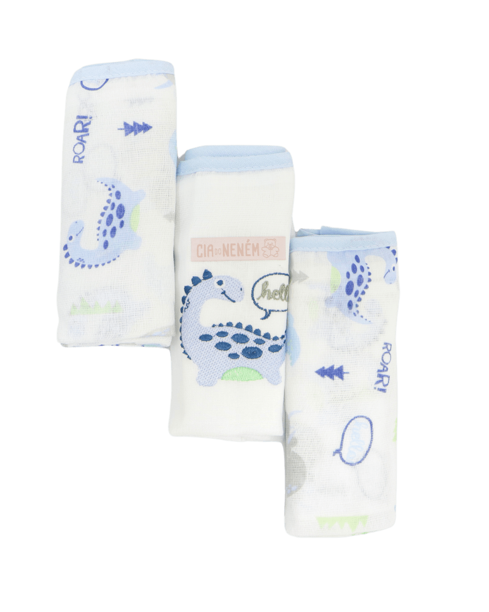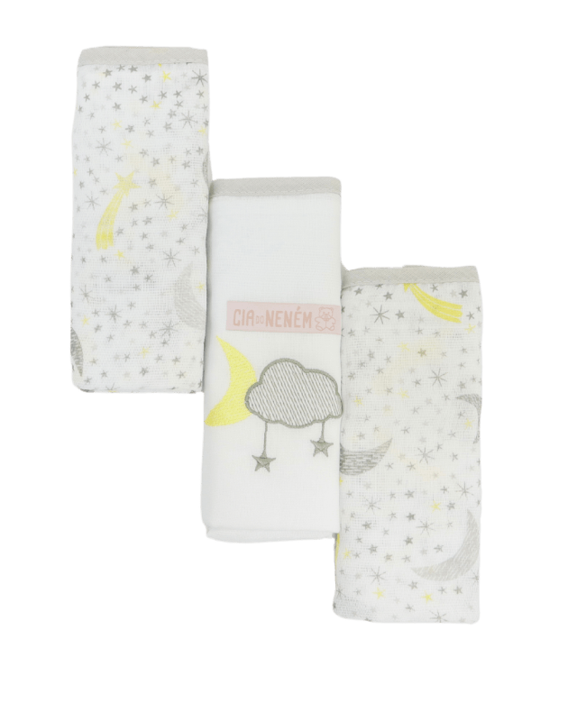 Kit fralda Cia do nenem com 3 unidades tecido duplo com bainha modelo bordado e estampado. Medidas: 70cm X 68cm