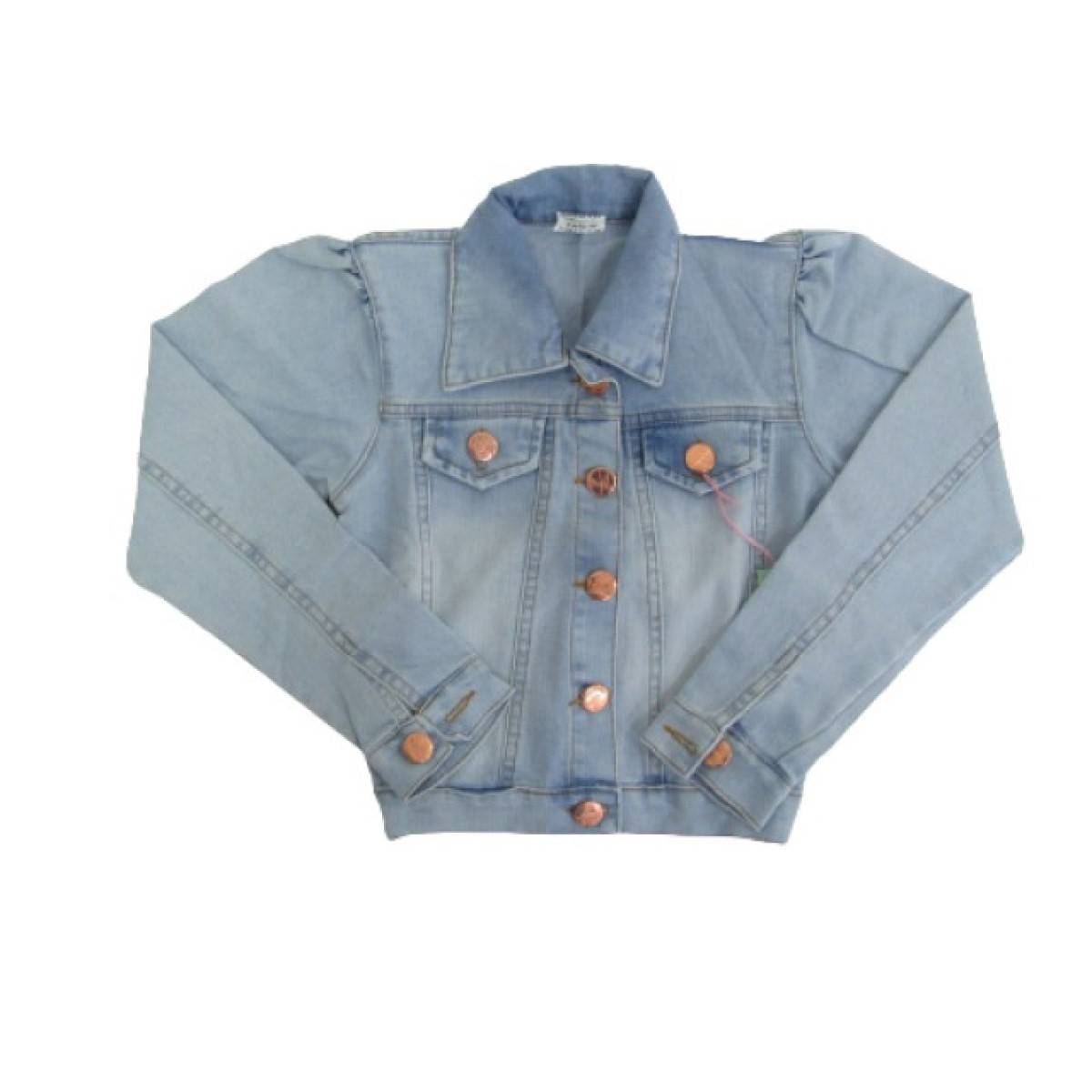 Jaqueta jeans feminina manga longa ,com bolsos frontal fake com botões, gola esporte, punho com botão, lavagem clara, manga bufante. Barra acabamento simples com elástico traseiro.