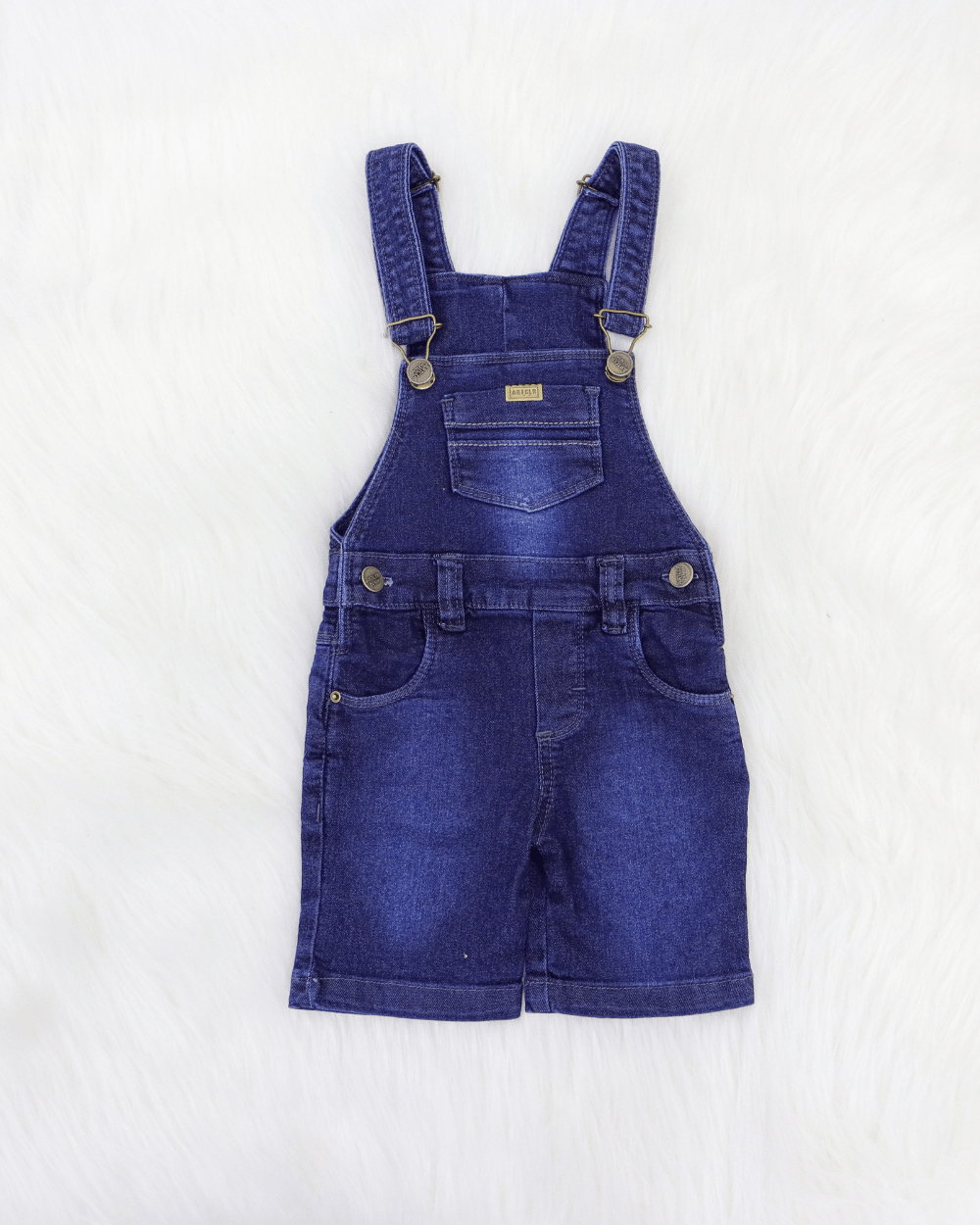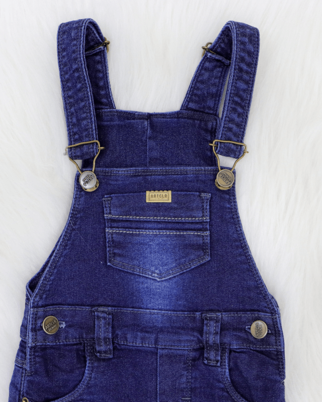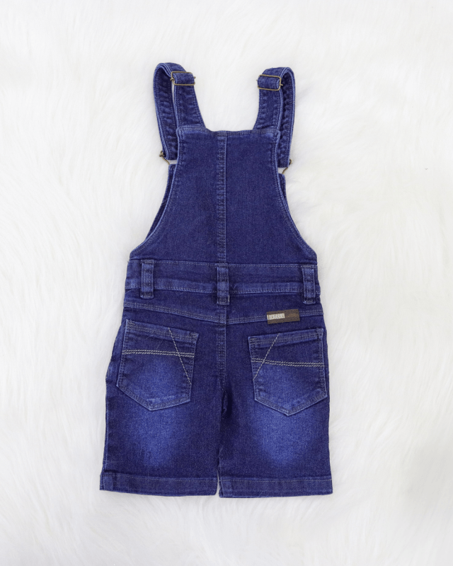 Jardineira jeans curta masculina; peito com bolso; alça com regulagem; barra simples.