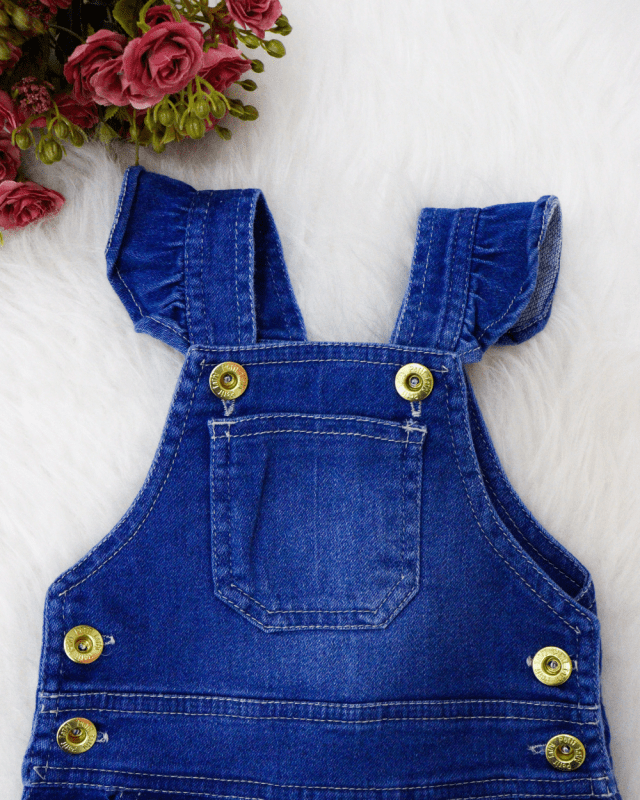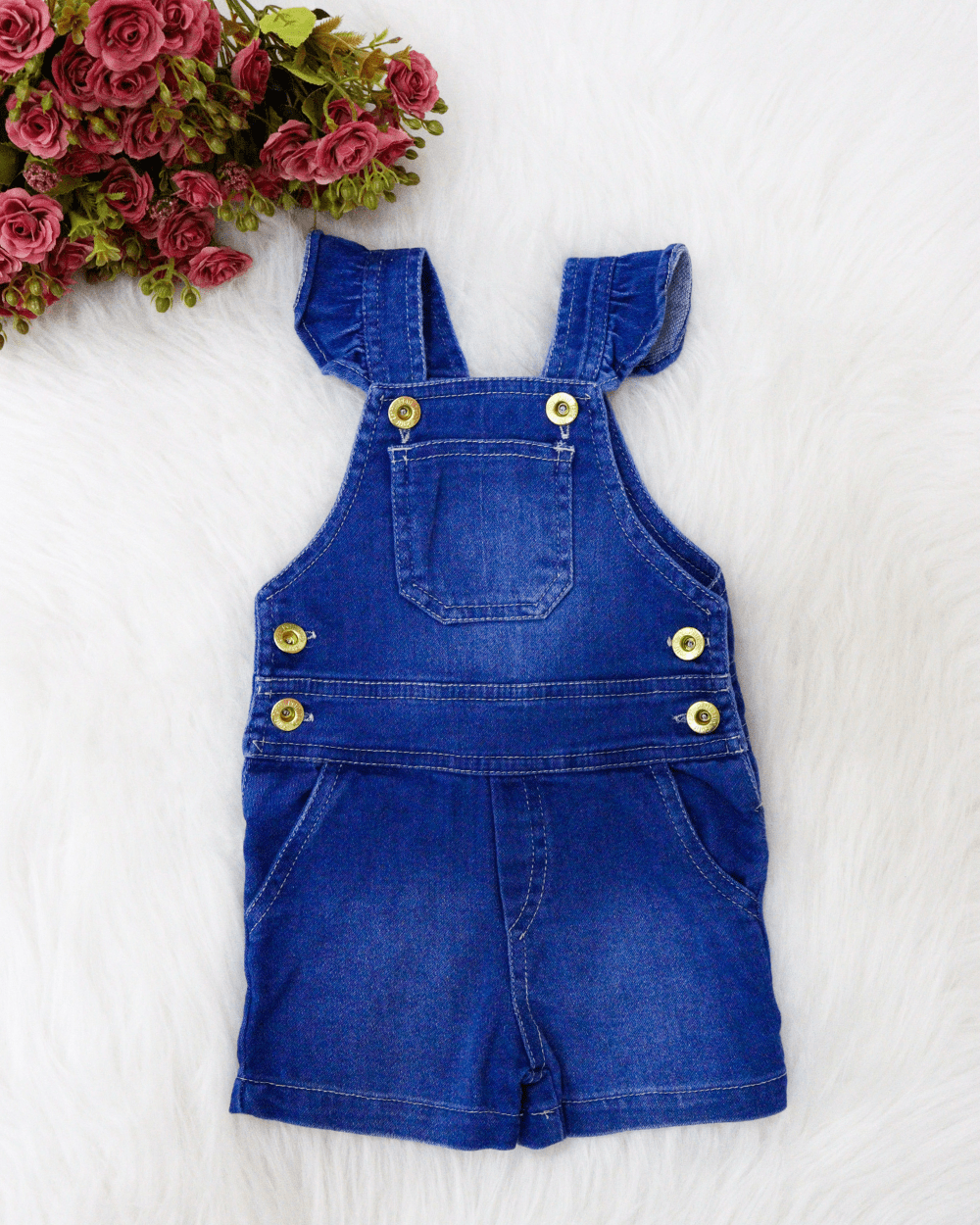 Jardineira Jeans feminina Petit Tathi, Modelo Shorts Saia, lavagem média com bolso em seu peito e em suas laterais, bolsos traseiros e barra simples para deixar ainda mais delicada!
