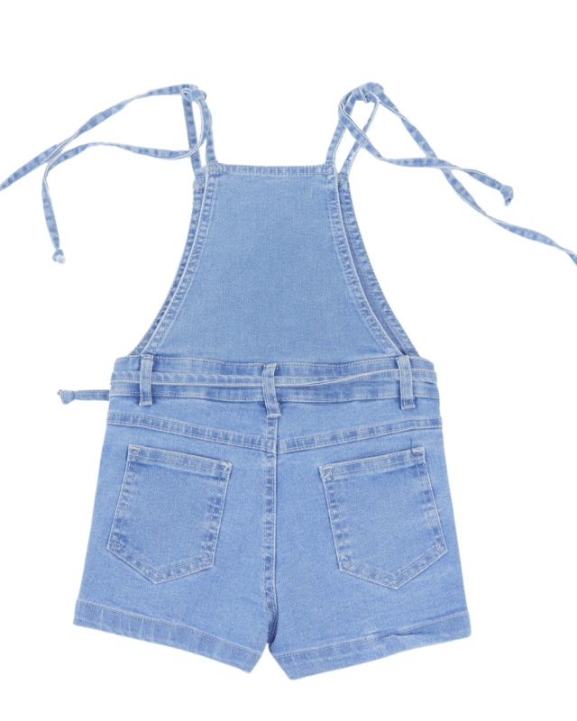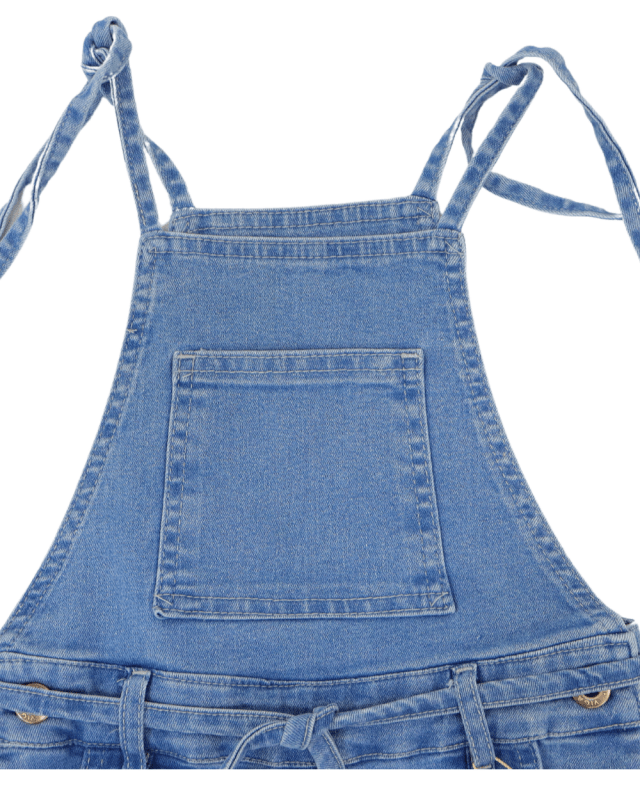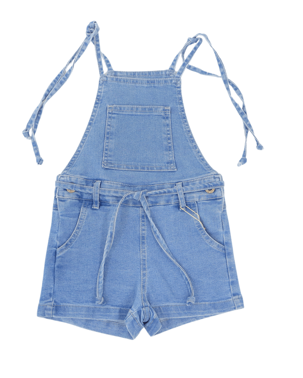 Jardineira jeans feminina vigat curta com bolso frontal e alcinhas para amarrar oque facilita na hora de regular na criança.