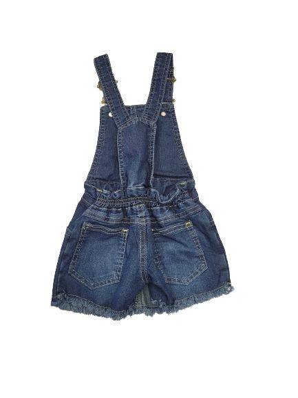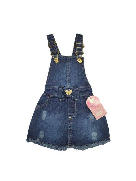 Jardineira jeans curta feminina, com bolso frontal e traseiros, fechamento com abotoamento, alça sem regulagem, cintura com detalhe de laço, traseiro com elástico para melhor ajusto ao corpo e bolsos. Barra levemente desfiada.