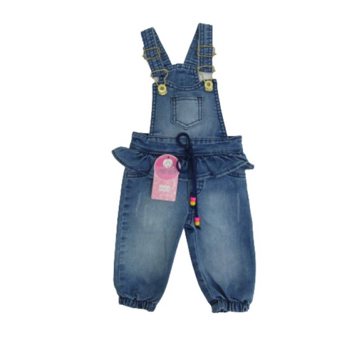 Jardineira jeans feminina infantil, lavagem média,bolsinho frontal , cintura com cordão e babado. Barra com acabamento simples com punho elástico. Alças com regulagem.