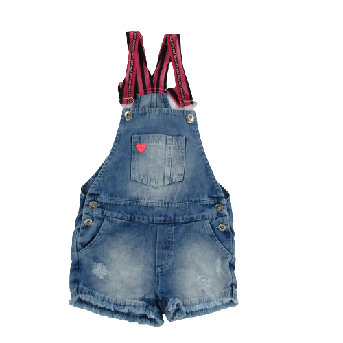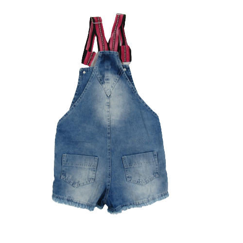 Jardineira jeans curta feminina, bolso frontal fake, bolso traseiro, alça média detalhada com regulagem. Barra acabamento desfiado.