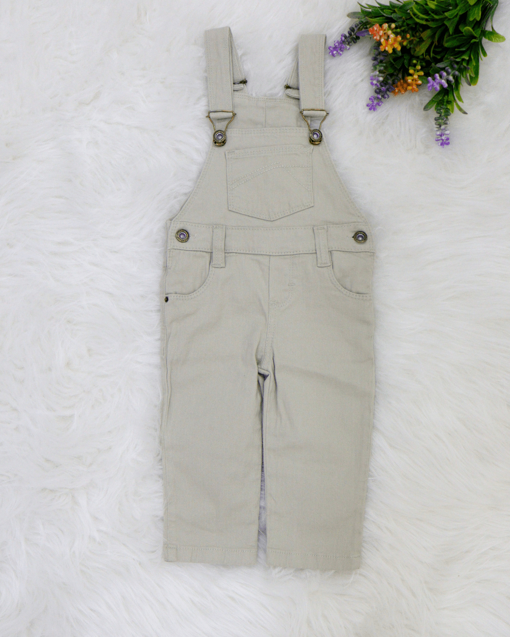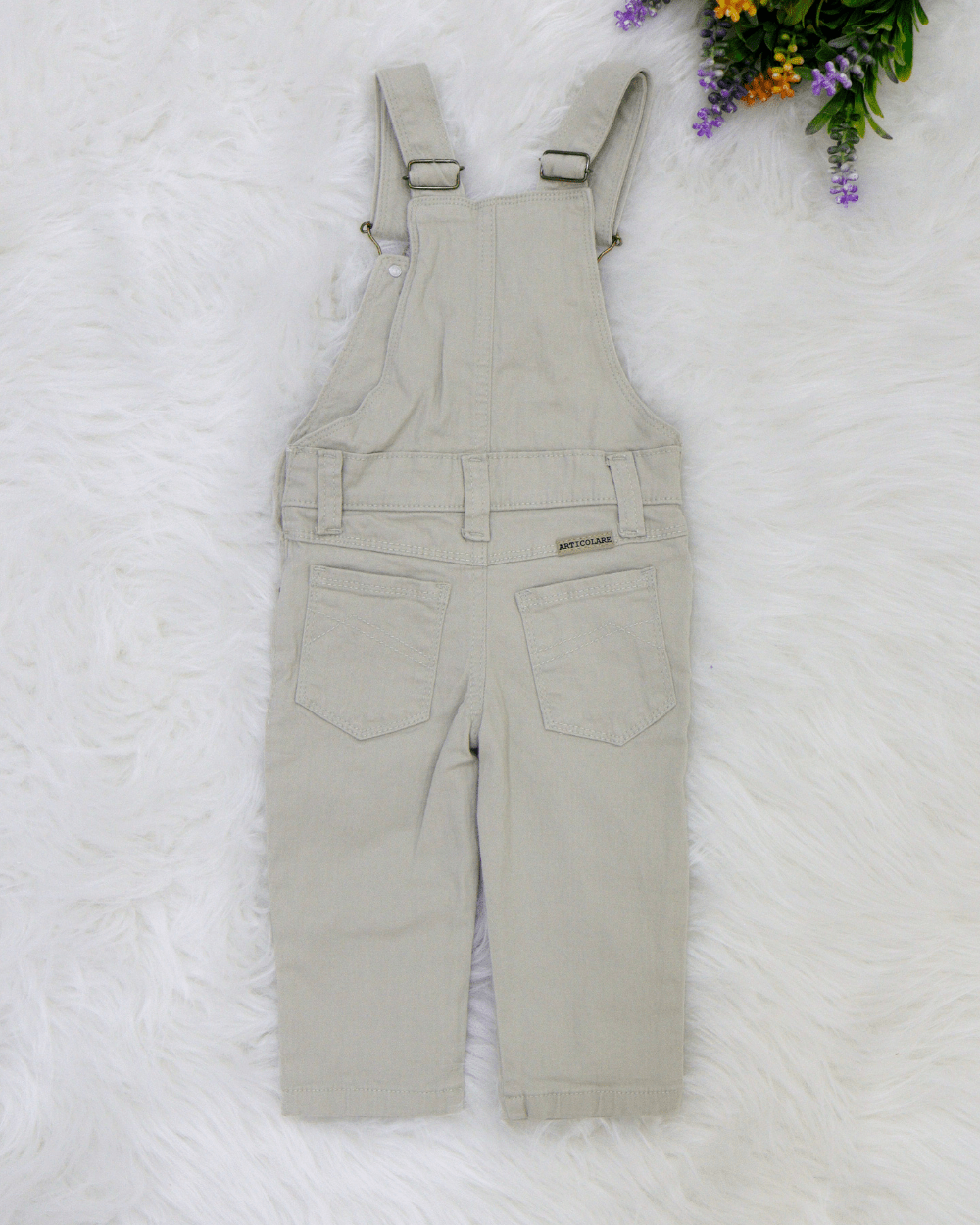 JARDINEIRA LONGA SARJA,BOLSO FRONTAL, FRISO LATERAL. COR BEGE.
