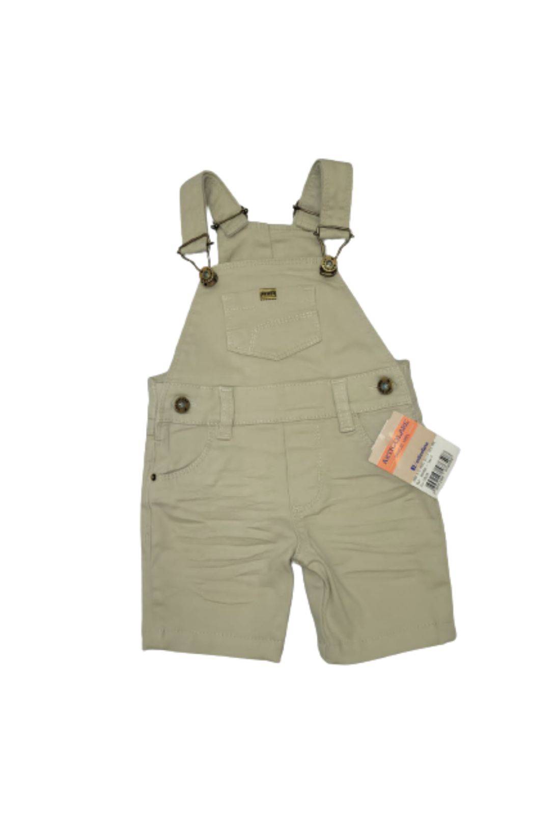 Jardineira de sarja, cor areia, curta masculina, com bolso frontal e traseiros, passante para cinto na cintura, fechamento com abotoamento lateral ,alça com regulagem , barra com acabamento simples.