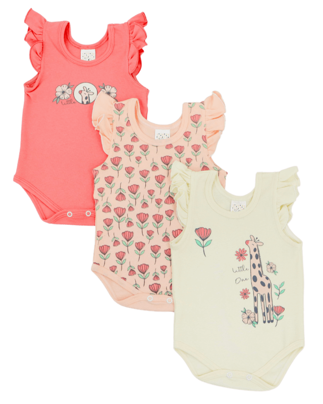 Kit de Body regata, Petutinha com 3 peças, modelinho em suedine, estampado com fechamento por botões entre as pernas.