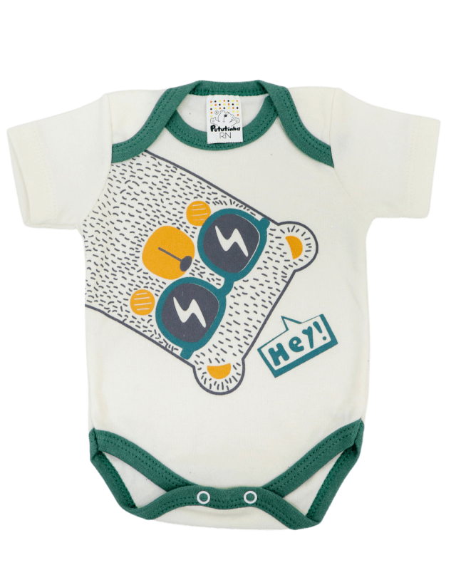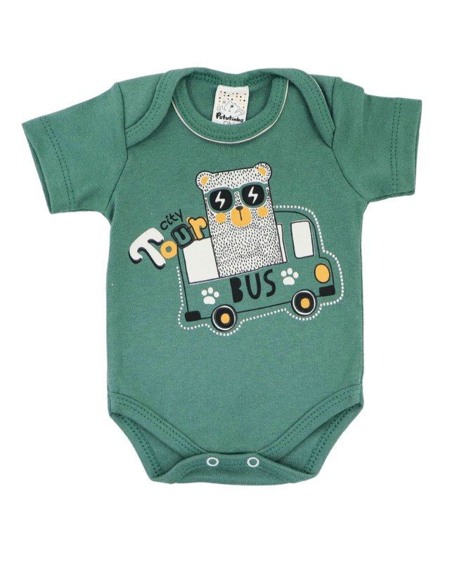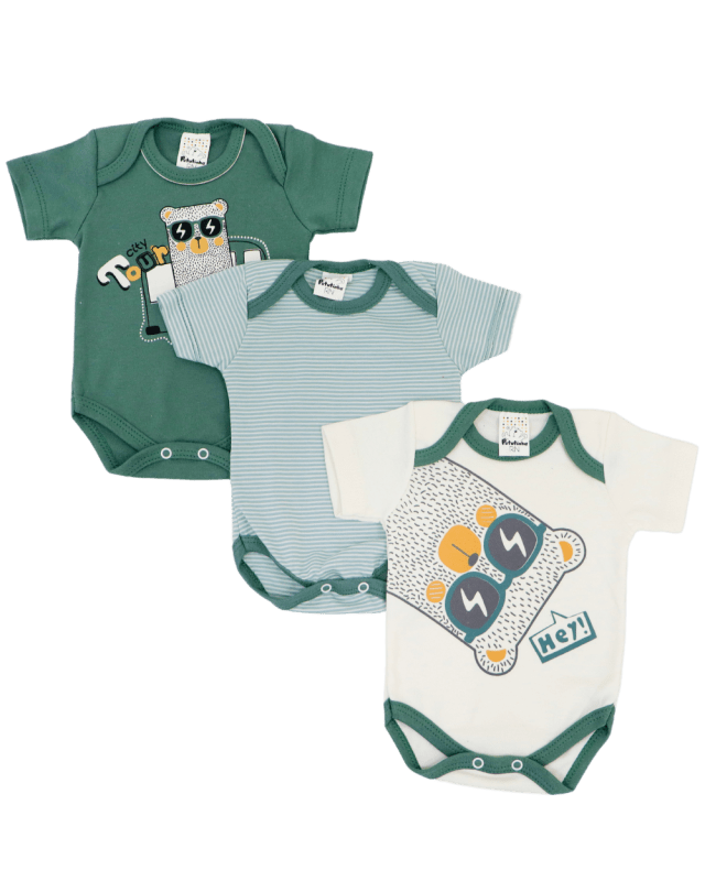 Kit de Body manga curta, Petutinha com 3 peças, modelinho em suedine, estampado com fechamento por botões entre as pernas.
