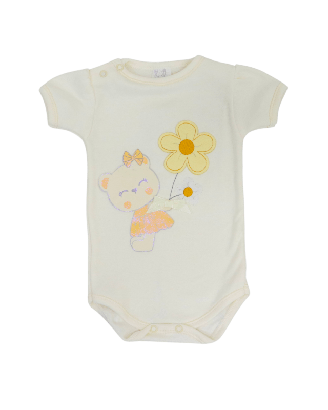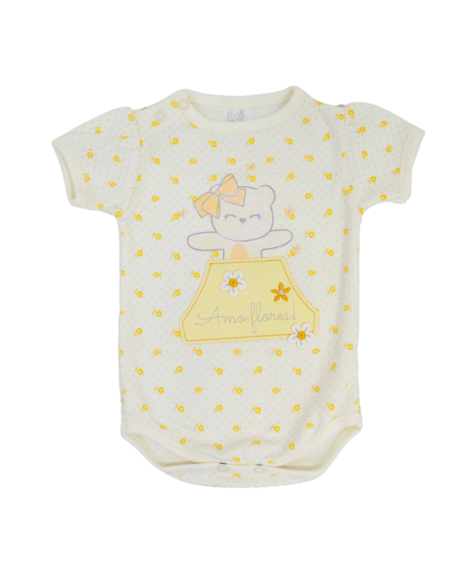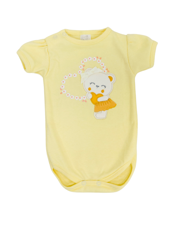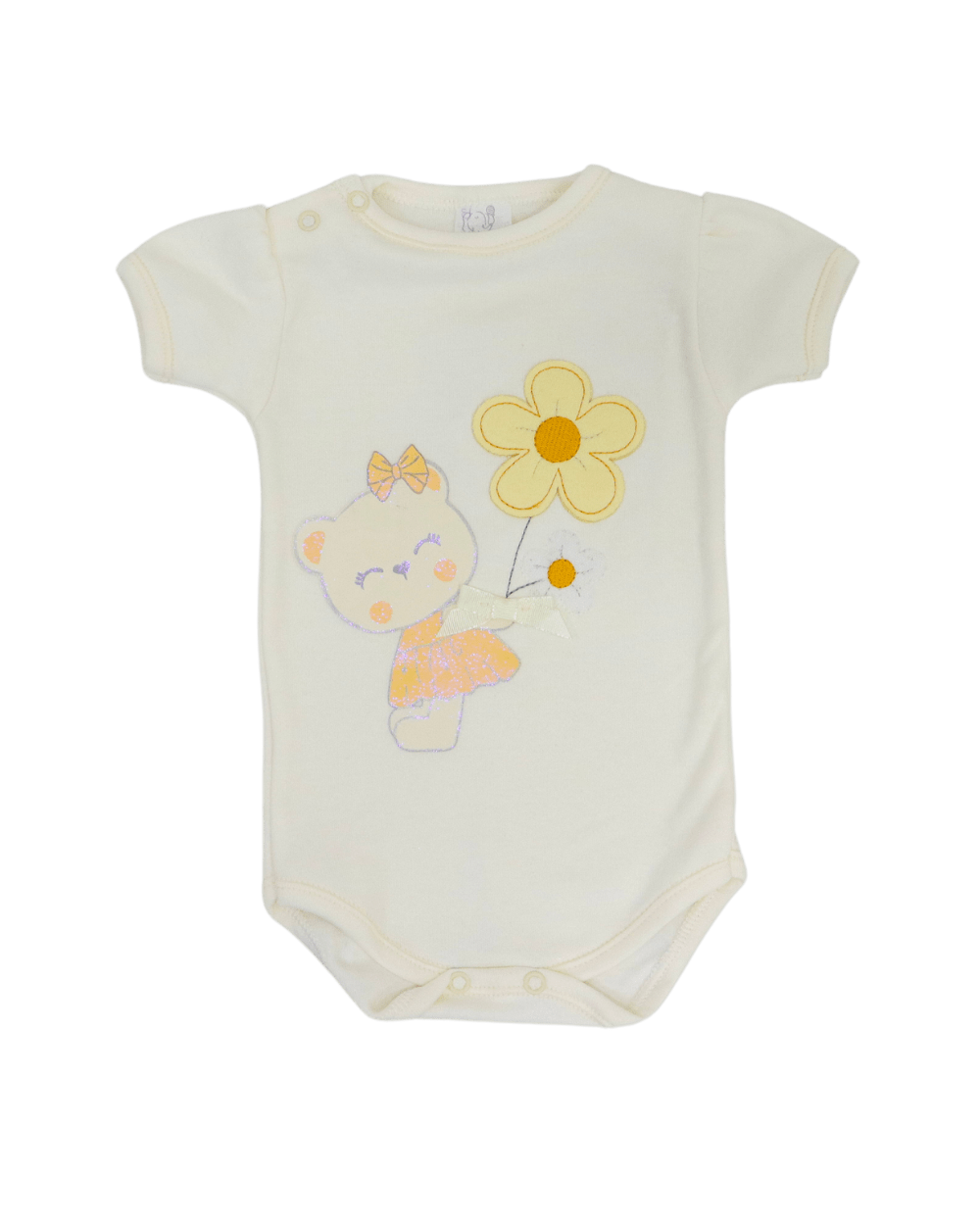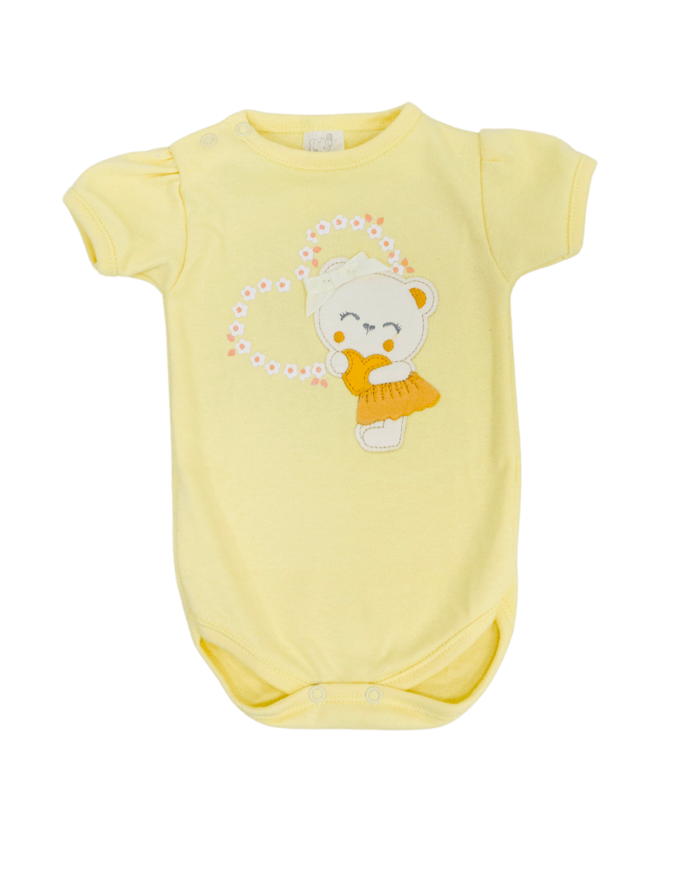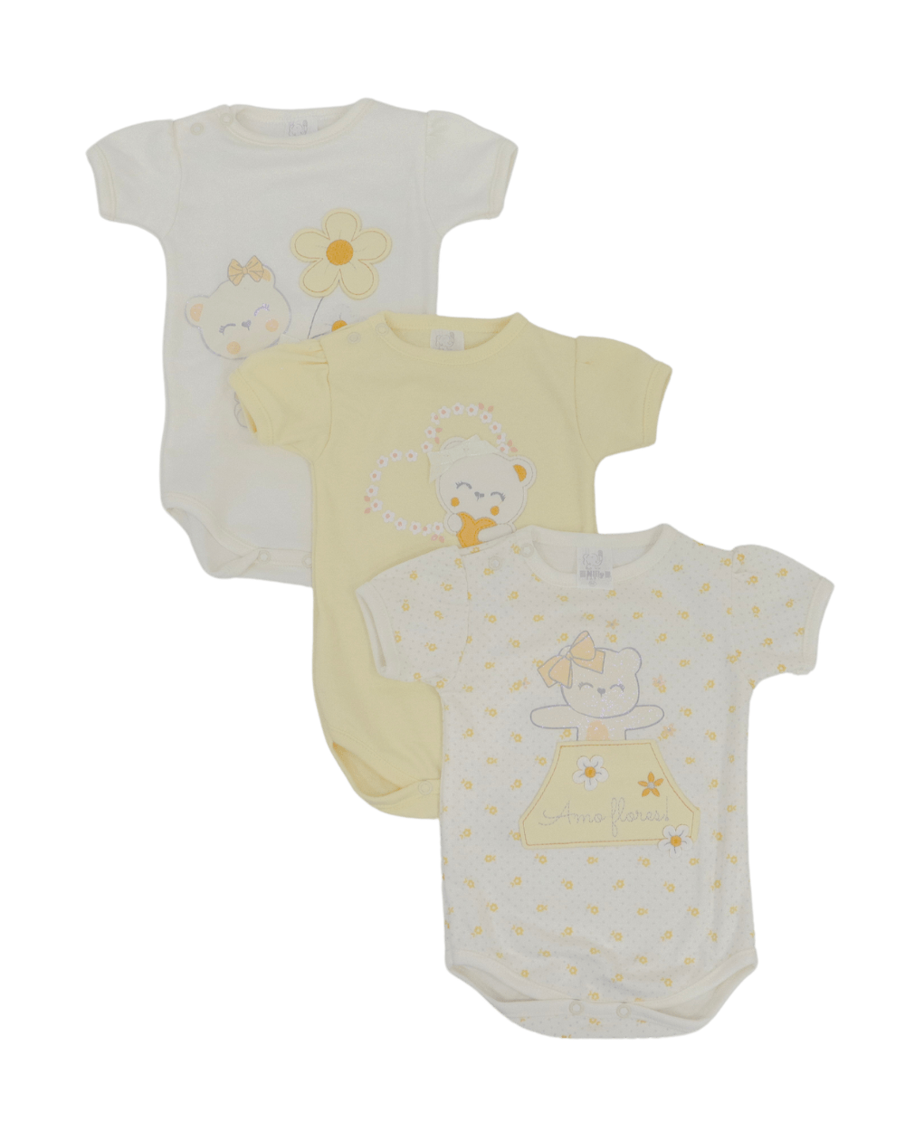 Kit de Body manga curta, Nilly Baby com 3 peças, modelinho em suedine, bordado com fechamento por botões entre as pernas.