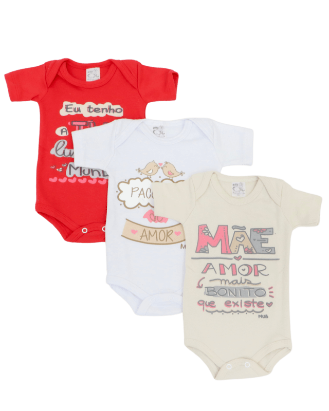 Kit de Body manga curta, Mub com 3 peças, modelinho em suedine, estampado com fechamento por botões entre as pernas.