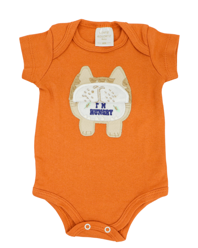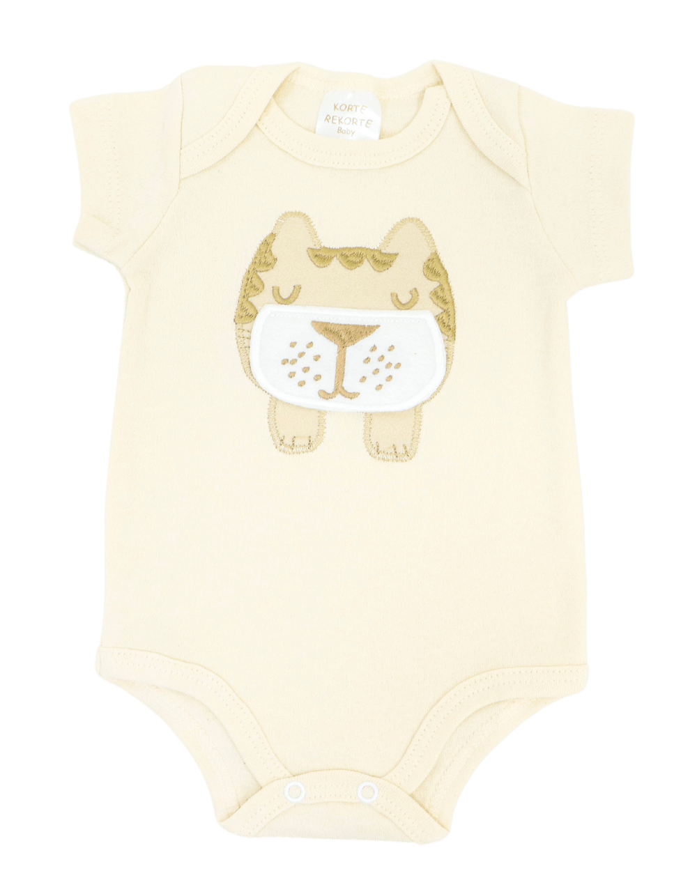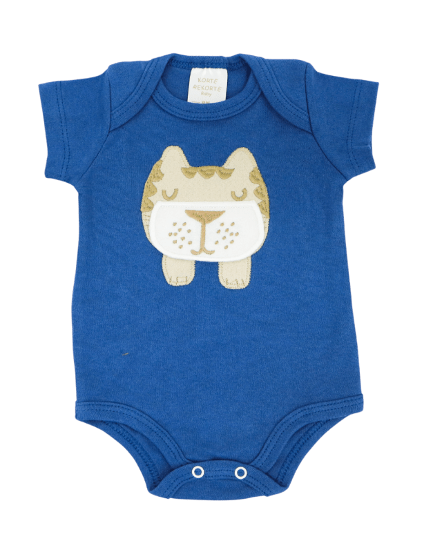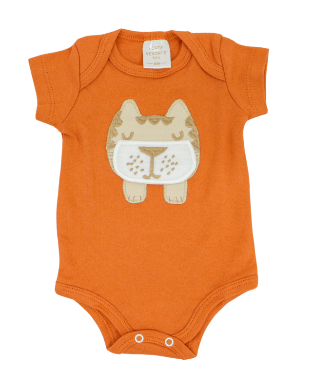 Kit de Body manga curta, Korte e Rekorte com 3 peças, modelinho em suedine, com bordado interativo com fechamento por botões entre as pernas.