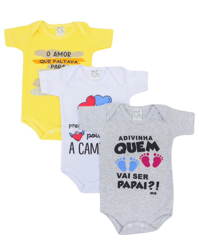 Kit de Body manga curta, Mub com 3 peças, modelinho em suedine, neutro estampado com fechamento por botões entre as pernas.