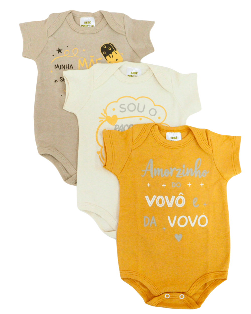 Conforto e estilo para o seu bebê! Kit com 3 body 100% algodão, toque suave e design moderno. Ideal para o dia a dia do seu bebê.