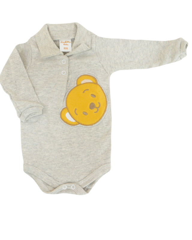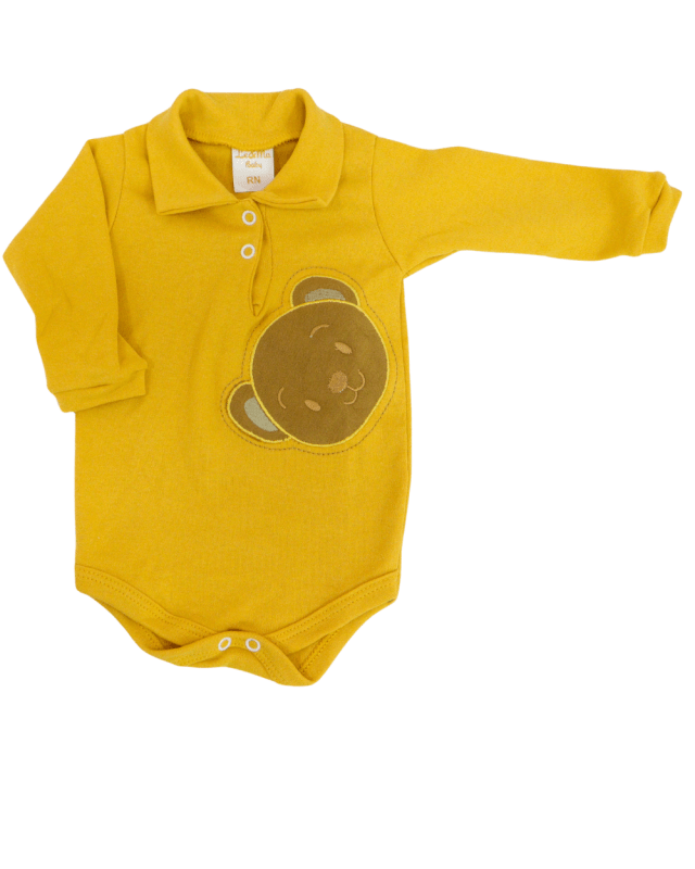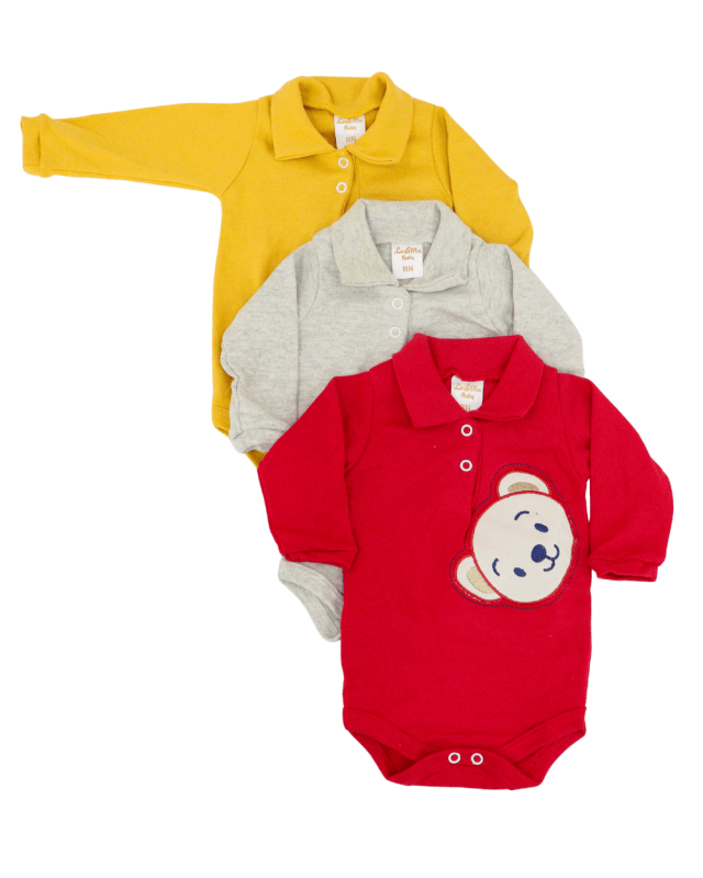 Kit de Body manga longa bordado, com 3 peças, modelinho em suedine, com fechamento por botões entre as pernas.