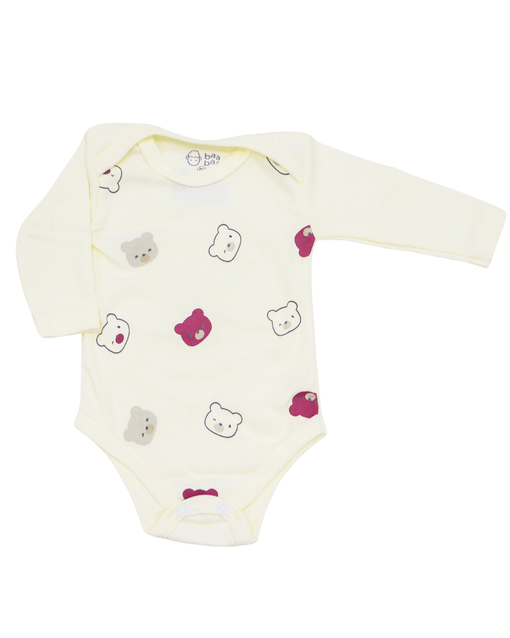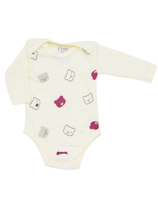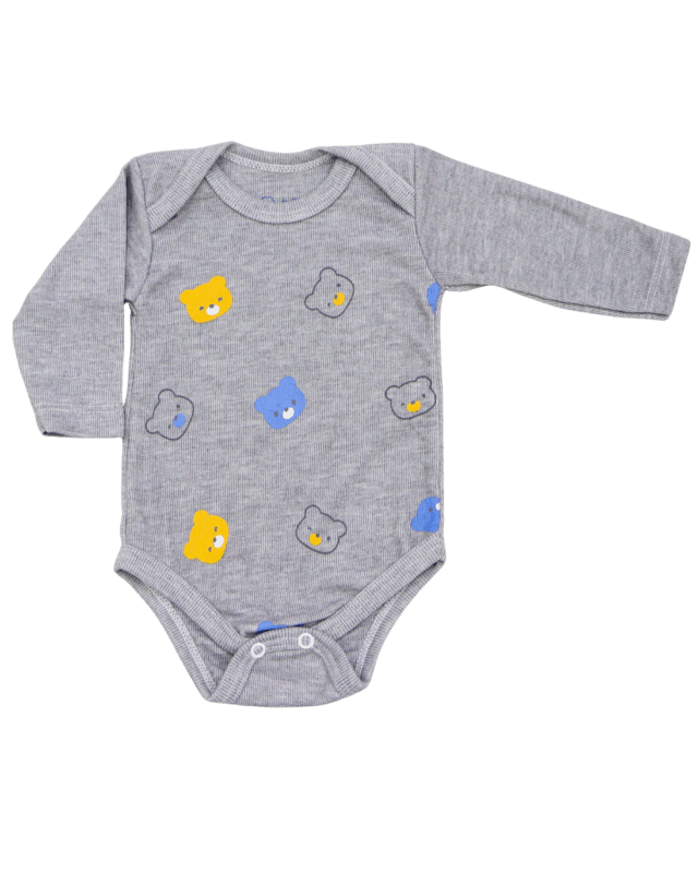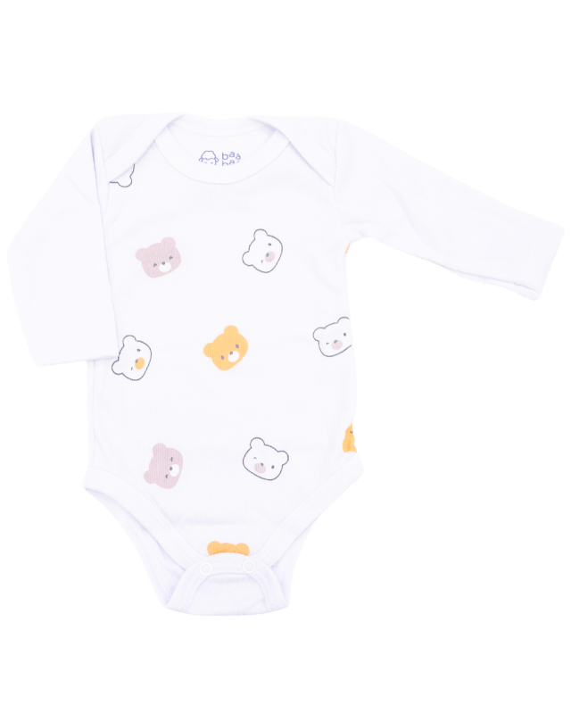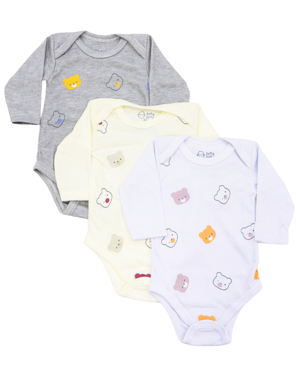 Kit de Body manga longa estampado com ursinhos, Baá-Baá com 3 peças, modelinho em suedine, com fechamento por botões entre as pernas.