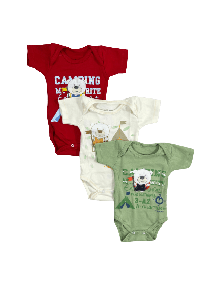 Body menino, manga curta, tecido suedine, gola com careca, bordado. PACOTE COM 3 UNIDADES.