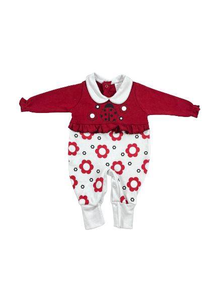 Macacão Feminino Suedine, sem pézinho, fecho em botões de pressão e pala com detalhe de recorte ondulado e estampa de joaninha e florzinha.