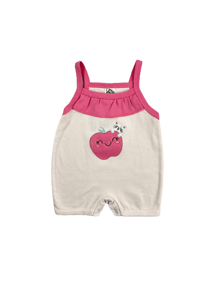 Macacão curto de alça, bordado MAÇA, malha, abotoamento entre as pernas.