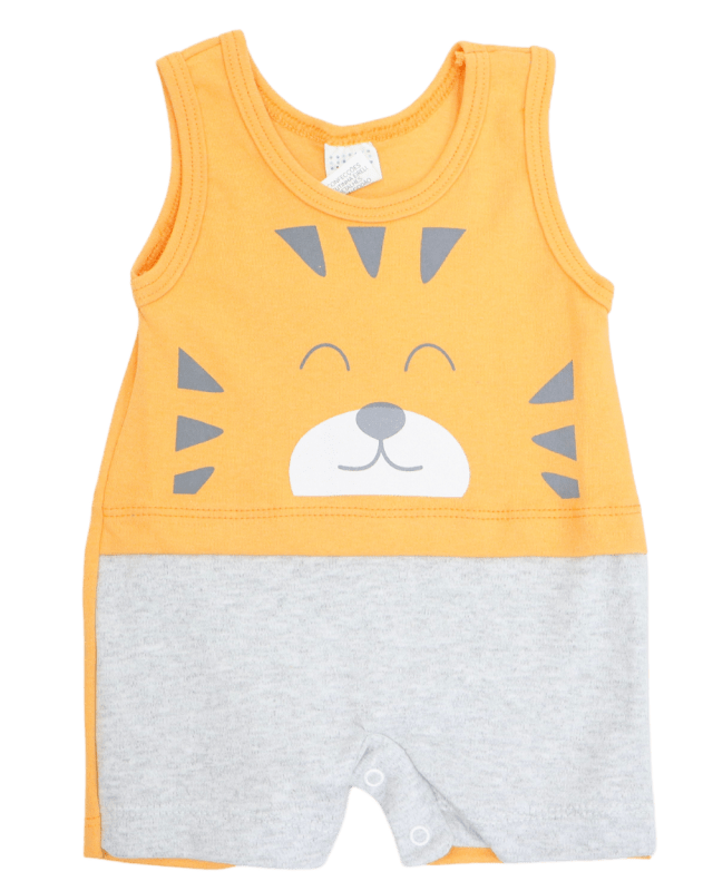 Macacão banho de sol curto, malha, abotoamento entre as penas modelo liso com estampa no centro.