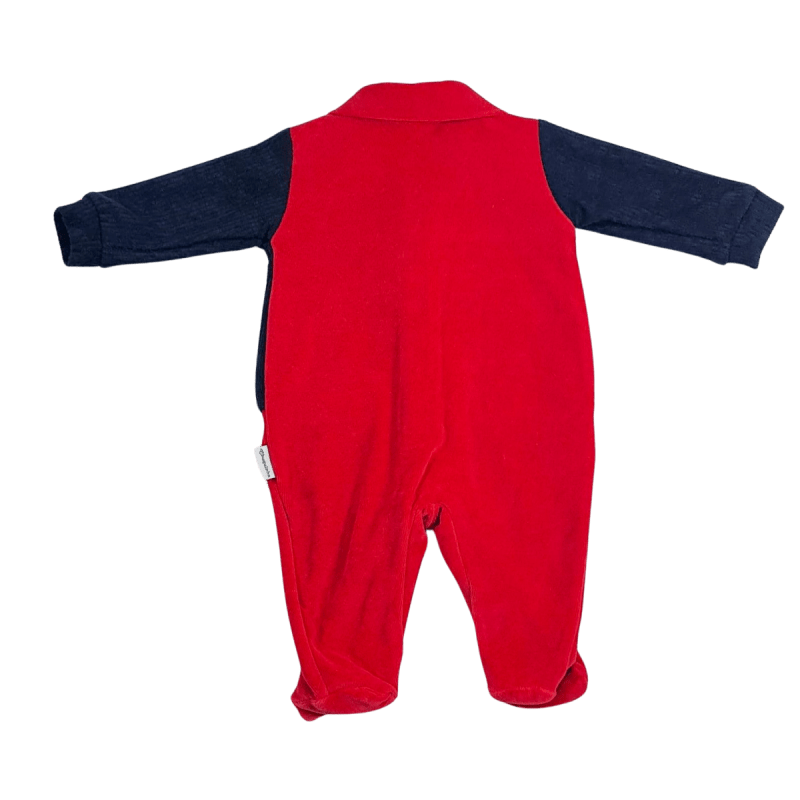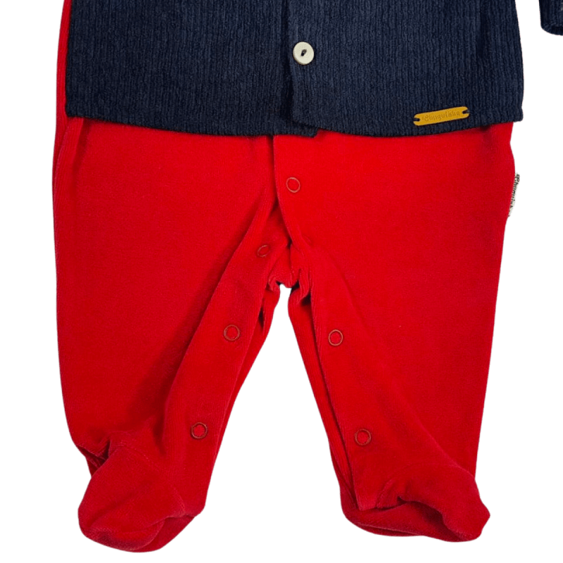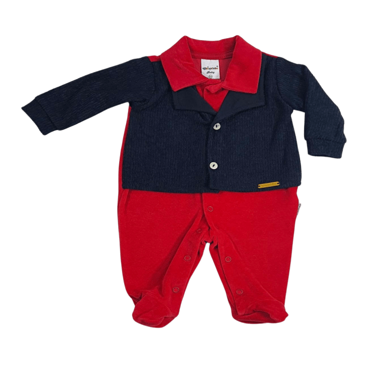 Macacão em plush com colete efeito canelado, porem costurado mais com botões para dar o charme, com pezinho e fechamento em abotoamento frontal. Cor: Vermelho com Preto Composição: 80% Algodão 20% Poliéster