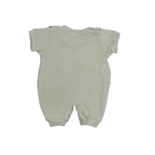 Macacão curto para bebê em suedine com estampa, fechamento botão entre as pernas , gola redonda.