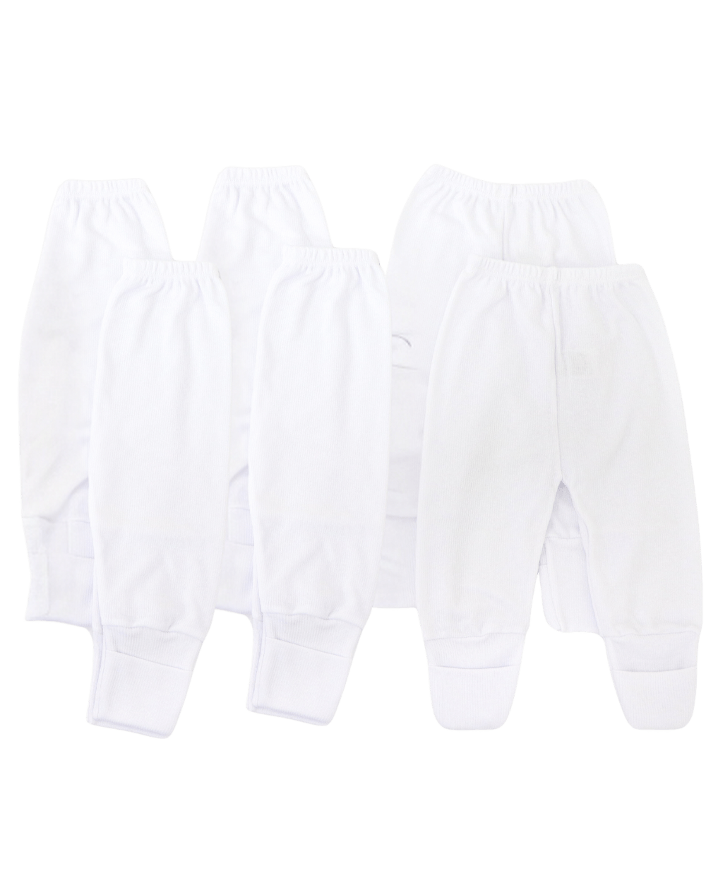 Mijão liso Little Baby pacote com 6 peças todas na cor BRANCA, modelo vira pé com cintura elástica para maior conforto do bebê.