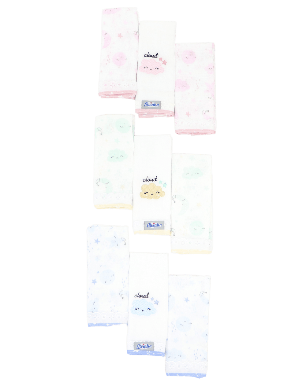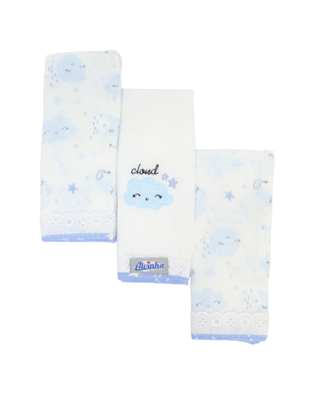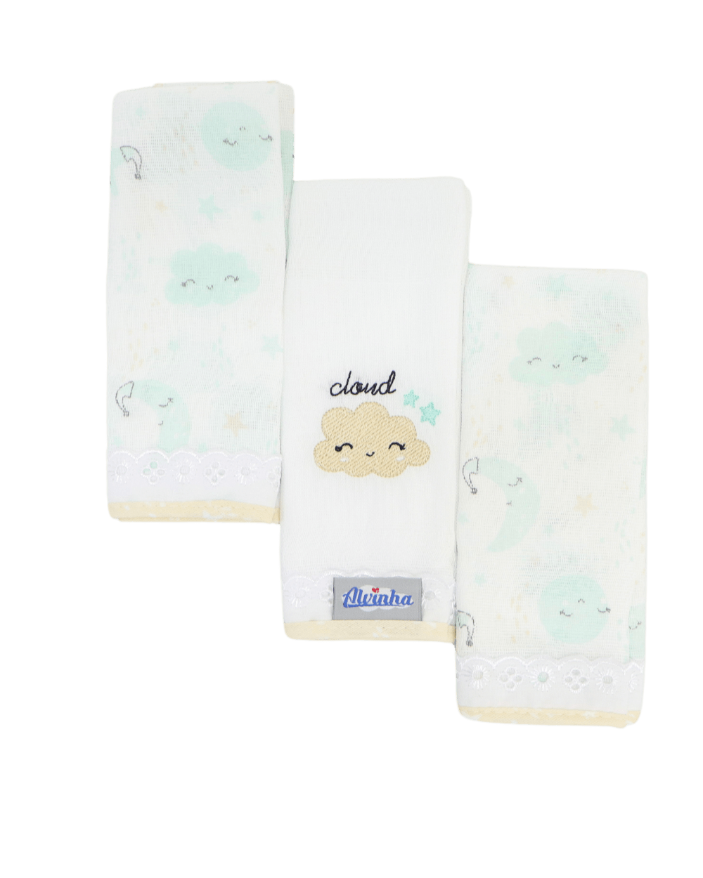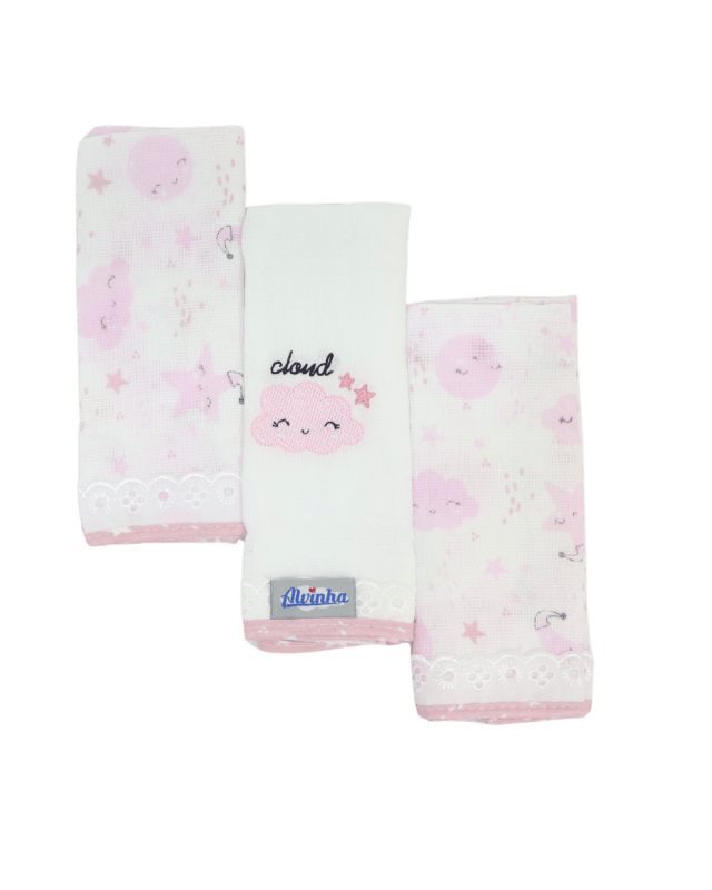 Kit de pano de boca Minasrey Alvinha o kit vai com 3 peças sendo 2 estampadas e uma bordada. Medida: 32cm X 32cm