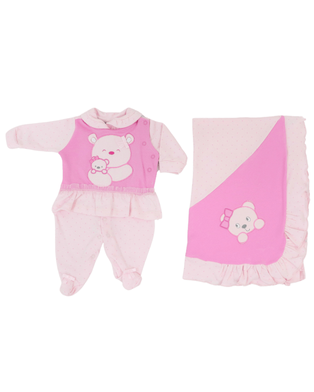 Saída de maternidade suedine menina, macacão manga longa peito bordado. Acompanha manta.