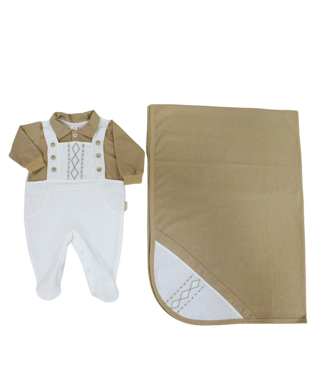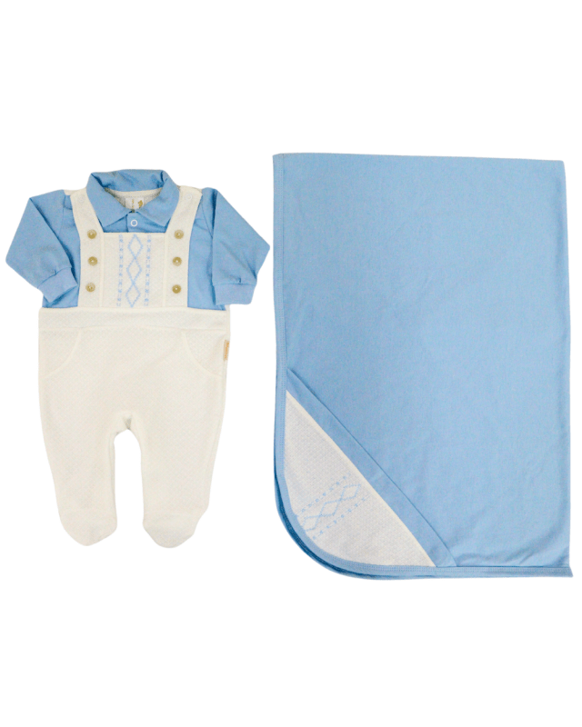 Saída Maternidade Chuquinha Menino, macacão manga longa e acompanha manta.