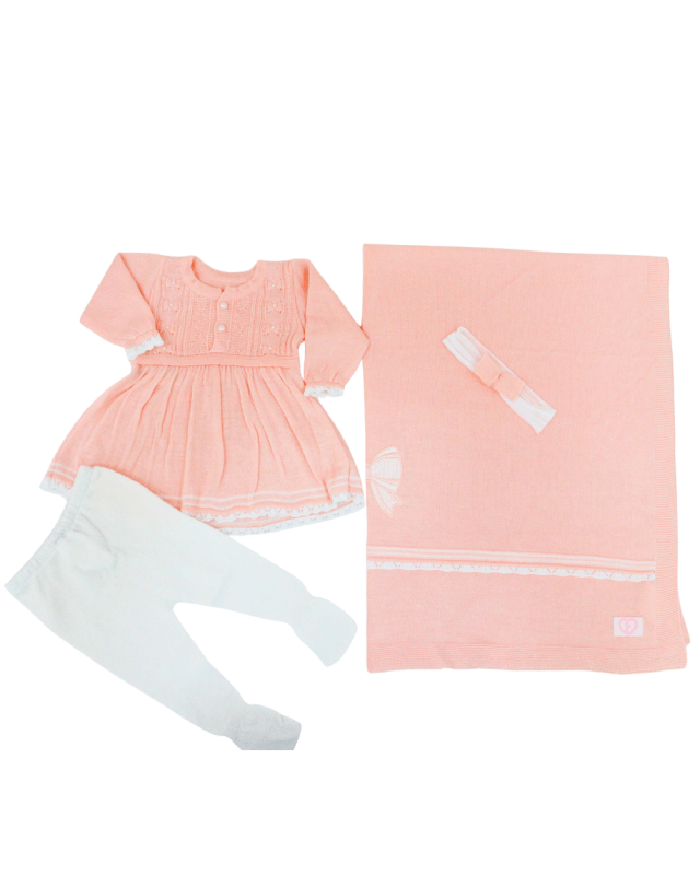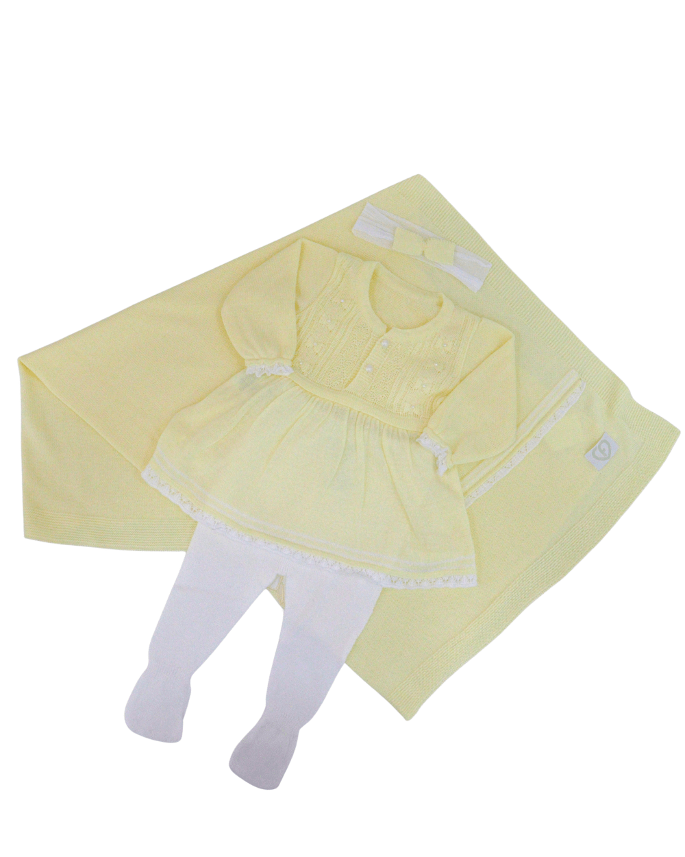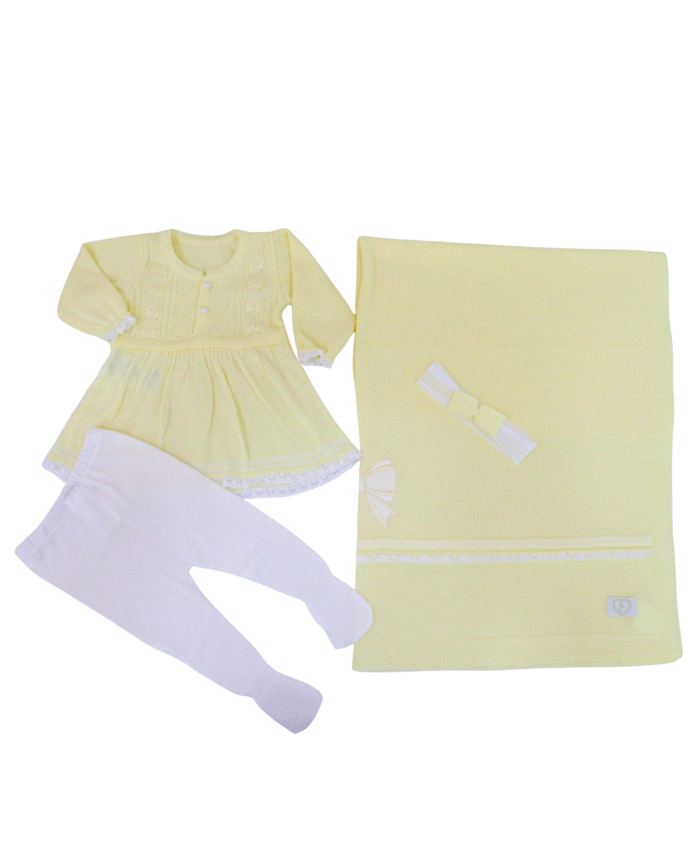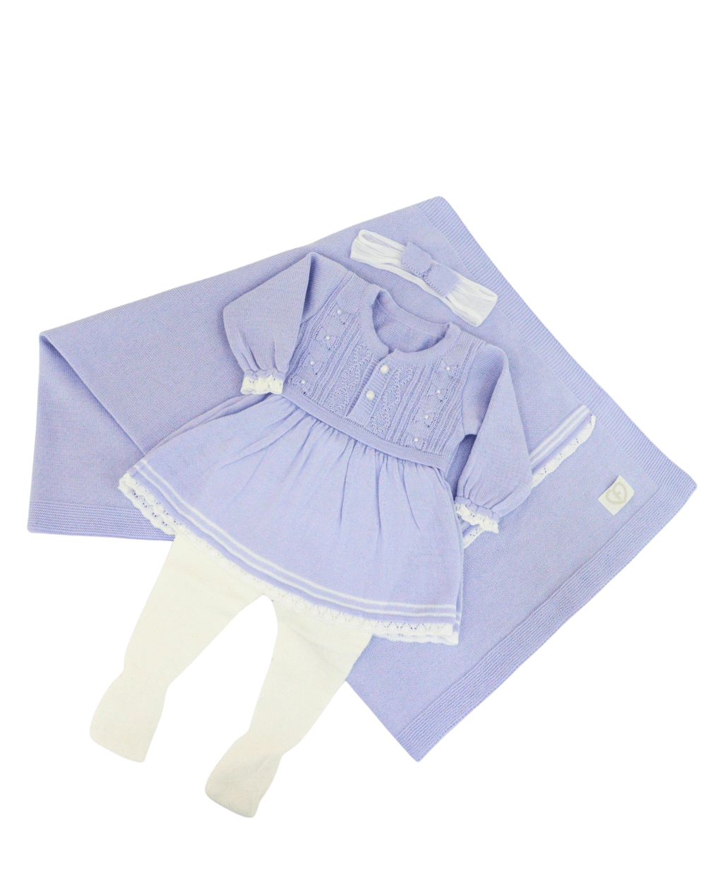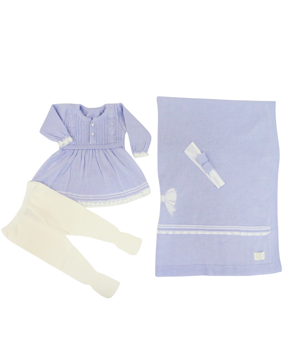 Saída de Maternidade Fofinho Menino, contém:1Vestido manga longa, 1Meia calça, 1faixa de cabelo e 1 manta.