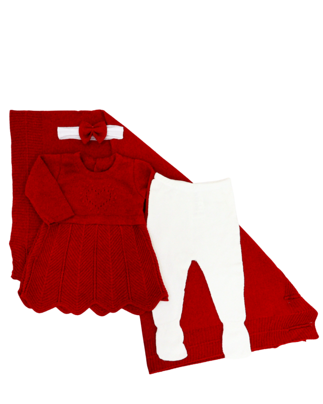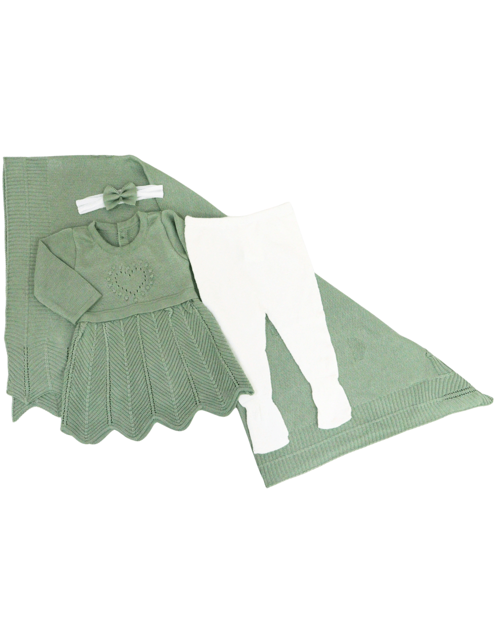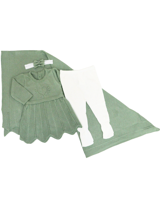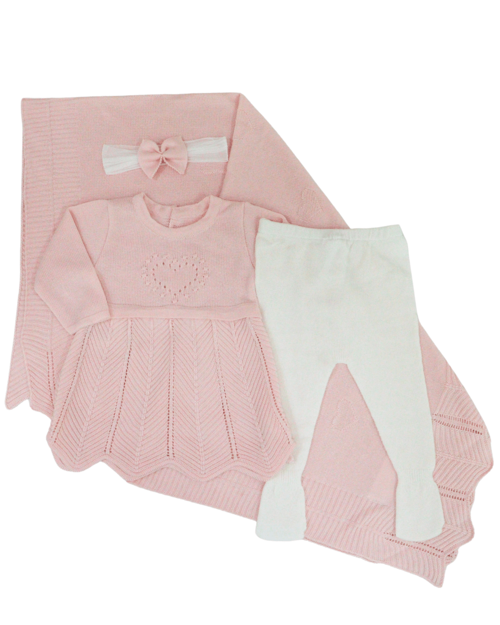 Saída de Maternidade Fofinho Menina, vestido manga longa, meia calça, faixa e acompanha manta.