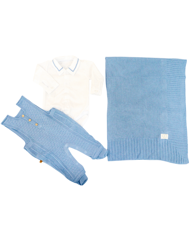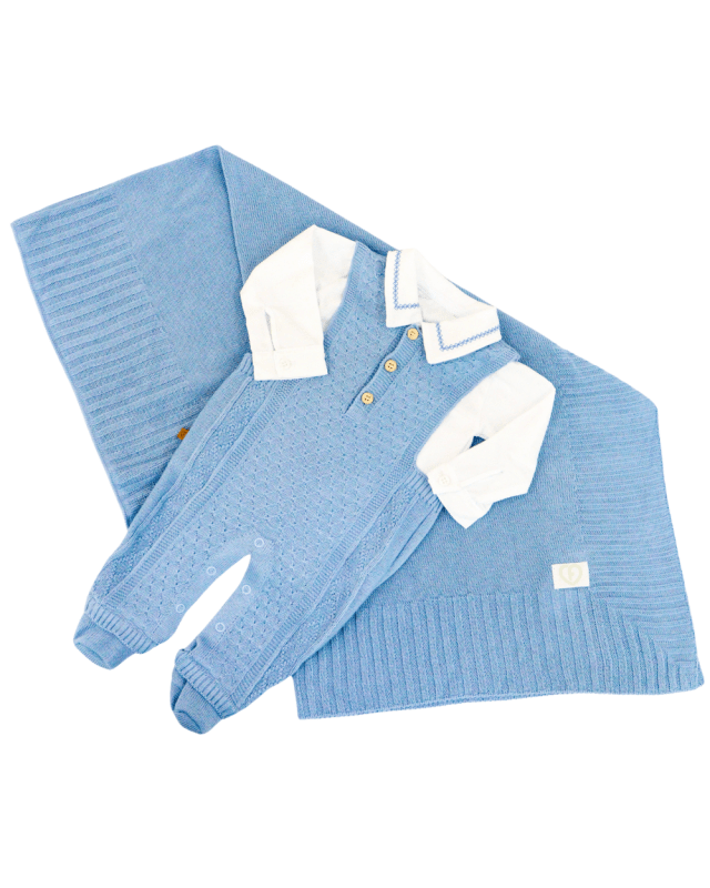 Saída de Maternidade Fofinho Menino, body manga longa, macacão e acompanha manta.