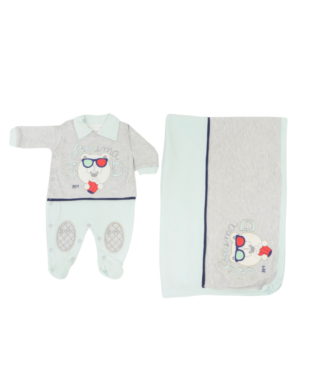 Saída de maternidade suedine menino, macacão manga longa peito bordado. Acompanha manta.